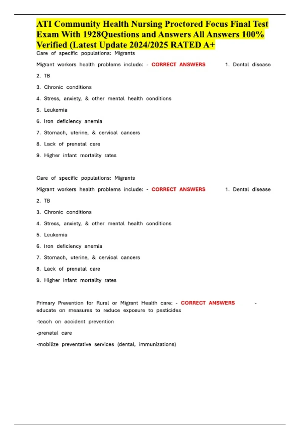 This comprehensive document is a complete study guide for the ATI Community Health Nursing Proctored Final Exam, featuring an extensive bank of 1,928 verified questions and answers. The content is specifically focused on the high-yield section: Care of Specific Populations (Migrant, Rural, Vulnerable). It covers essential topics like primary prevention for migrant workers (pesticide exposure), common health problems (TB, anemia, mental health), infant mortality rates, and dental care. Structured for focused review and self-assessment, this guide ensures candidates are prepared for the latest 2024/2025 test version to achieve a guaranteed A+ score.