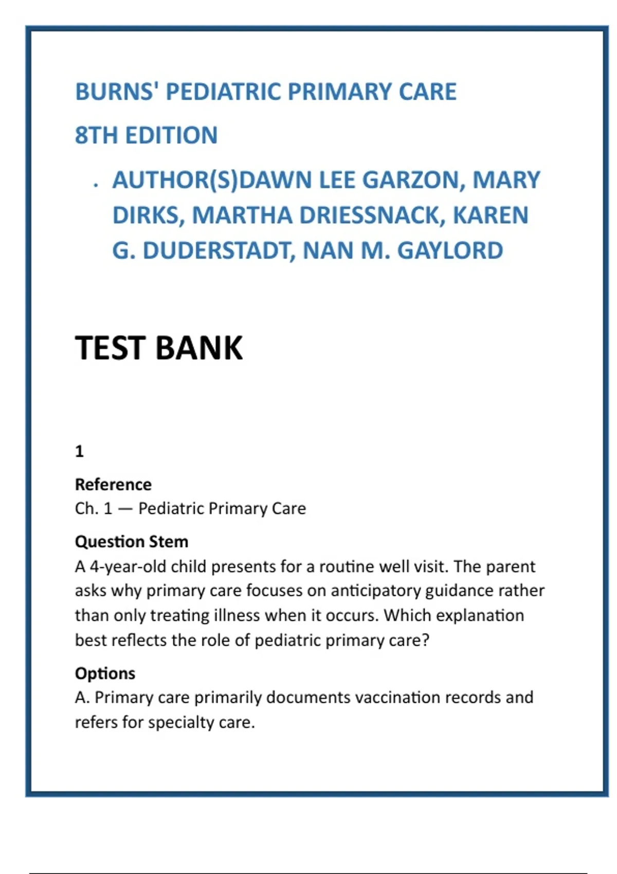 Burns’ Pediatric Primary Care — 8th Ed. Complete Test Bank | 20 MCQs/Chapter with Answers & Rationales — PNP/NCLEX/FNP Prep Description: Master pediatric primary care with the only full-coverage digital test bank aligned to Burns’ Pediatric Primary Care, 8th Edition. This high-yield resource delivers every chapter tested: 20 clinically-focused MCQs per chapter (over 1,000+ items), each with a single-best answer and expert-verified rationale to build critical thinking, clinical reasoning, and exam confidence. Designed for Pediatric Nurse Practitioners (PNP), Family Nurse Practitioners (FNP), DNP students, NCLEX prep, and advanced practice nursing exams, this evidence-based question bank saves study time while boosting scores and readiness for real-world pediatric care. Why learners choose this resource: Targeted practice that mirrors exam-style application/analysis questions Concise, expert rationales that teach pathophysiology, assessment, and interventions Covers anticipatory guidance, developmental surveillance, safety, and care coordination Optimized for rapid revision, spaced practice, and exam simulation Product features: FULL textbook coverage — ALL chapters from Burns’ 8th Edition 20 MCQs per chapter with one best answer and detailed rationales Questions written to assess application → analysis → evaluation levels Instant digital download; printable and compatible with LMS/CVs Ideal for clinical review, group study, and faculty item-banking Trusted & practical — built on Burns’ reputation as the gold standard in pediatric primary care, this test bank converts knowledge into clinical decision-making. Accelerate score gains, refine pediatric reasoning, and enter exams and practice with measurable confidence. Keywords: Burns Pediatric Primary Care test bank pediatric nursing MCQs PNP exam prep Burns 8th edition questions NCLEX pediatric practice questions pediatric primary care test bank FNP pediatric review advanced practice nursing test bank Hashtags: #BurnsPediatricPrimaryCare #PediatricNursing #PNPPrep #NCLEXPrep #FNPReview #PediatricTestBank #ClinicalReasoning #NursingExamPrep #Burns8thEdition #MedicalEducation