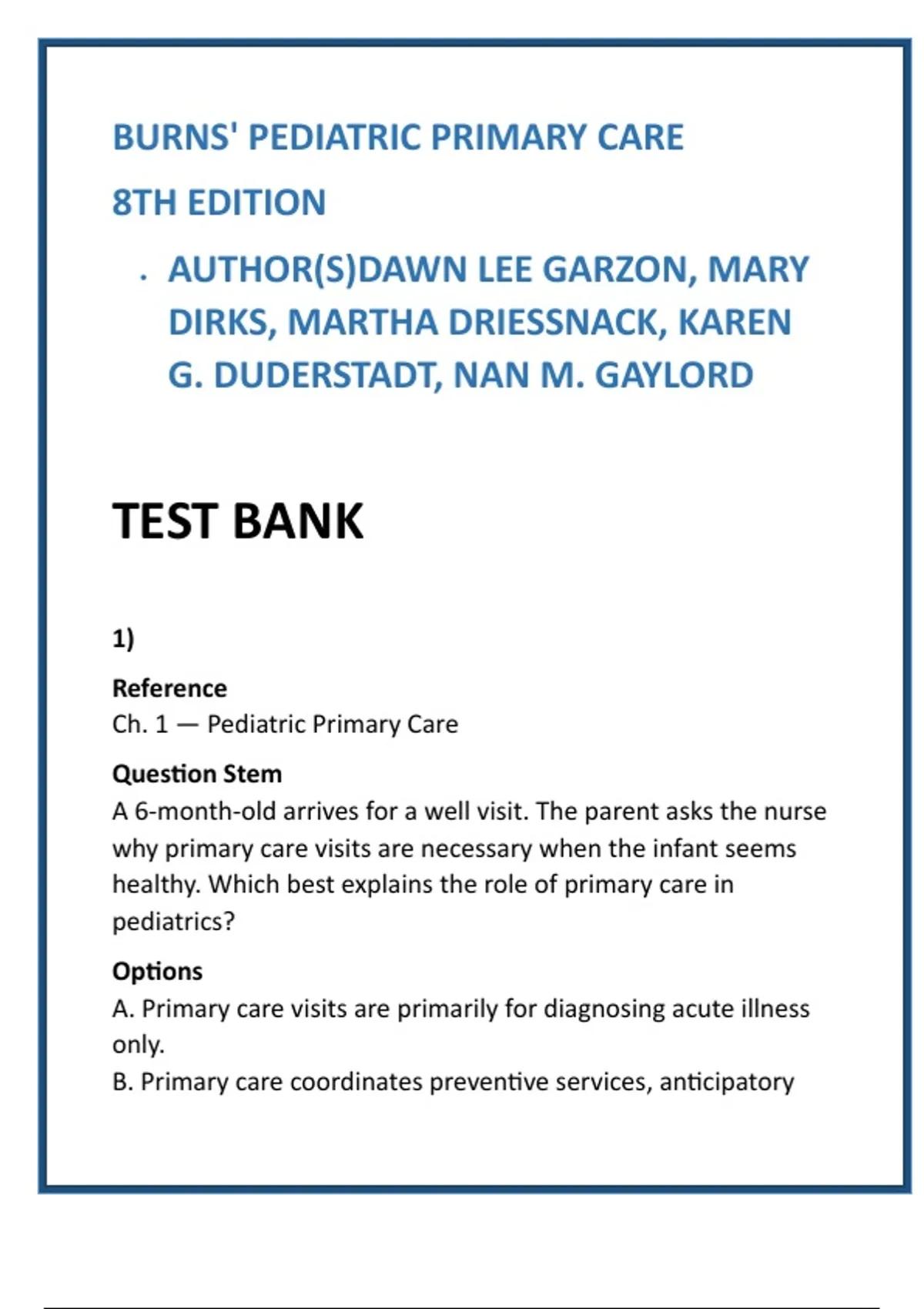 • Correct (B): Primary care in pediatrics includes prevention,