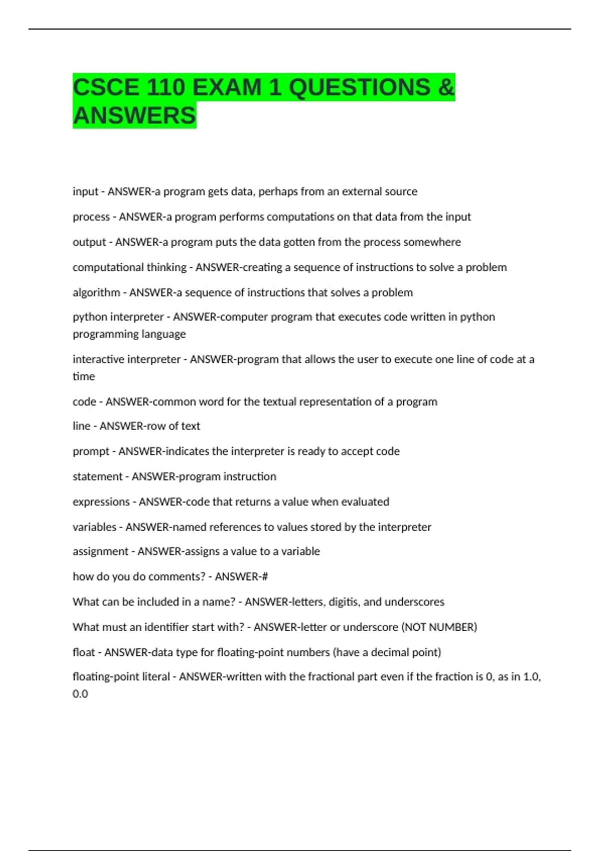 CSCE 110 EXAM 1 QUESTIONS & ANSWERS
