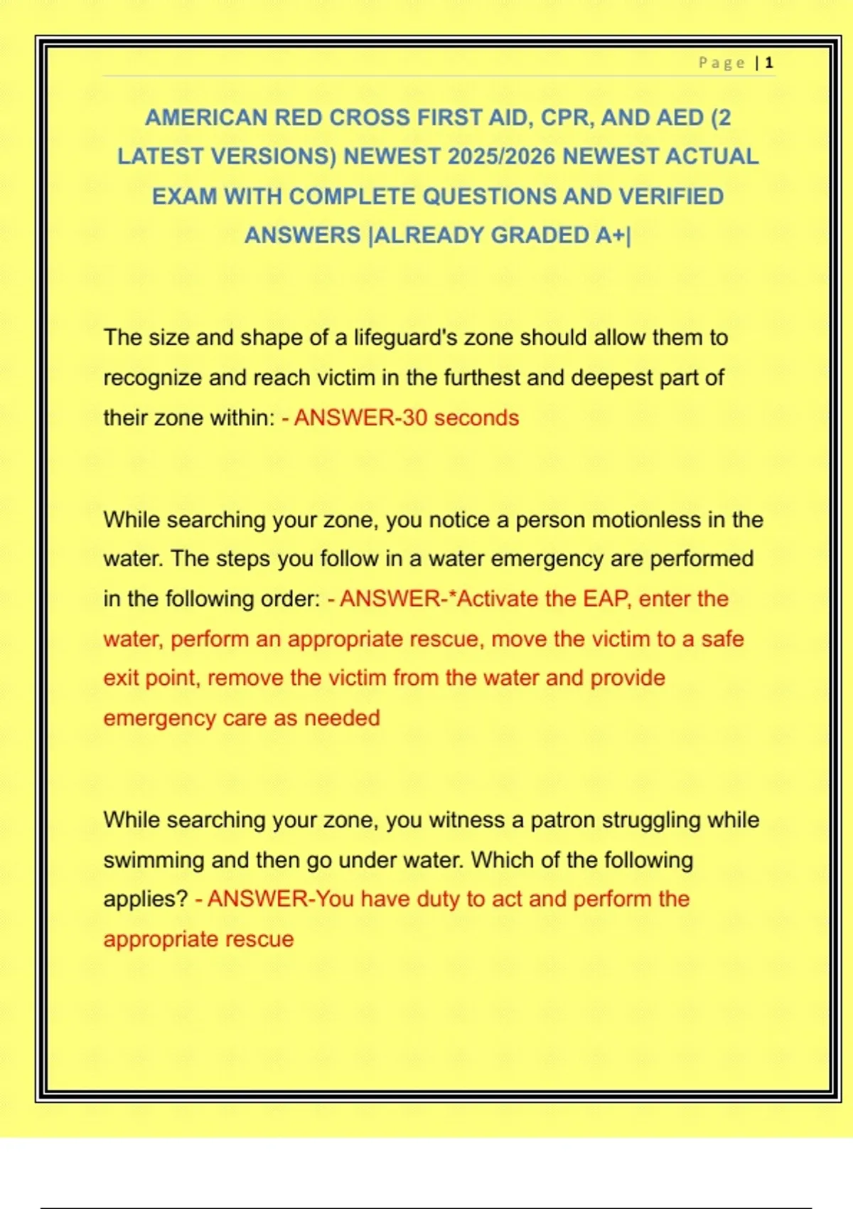 AMERICAN RED CROSS FIRST AID, CPR, AND AED (2 LATEST VERSIONS) NEWEST 2025/2026 NEWEST ACTUAL EXAM WITH COMPLETE QUESTIONS AND VERIFIED ANSWERS |ALREADY GRADED A+|