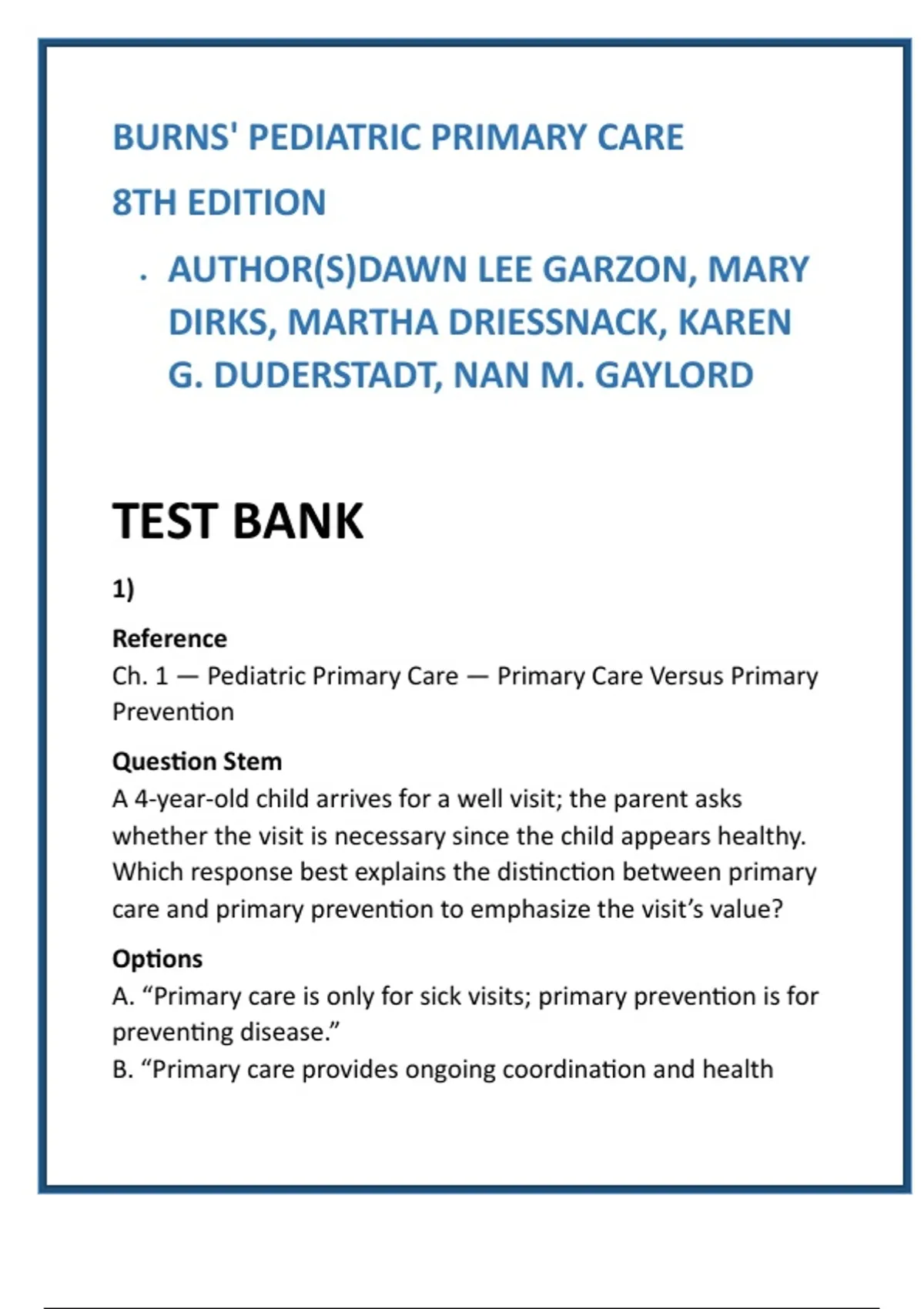 Burns’ Pediatric Primary Care 8th Ed — Complete Test Bank (All Chapters) — 20 MCQs/Chapter with Answers & Expert Rationales — PNP/FNP/NCLEX Prep Description: Master pediatric primary care with the only comprehensive, chapter-by-chapter test bank aligned to Burns’ Pediatric Primary Care (8th Ed.). Designed by clinician-educators and item-writing experts, this digital product delivers evidence-based, exam-focused practice to accelerate learning, sharpen clinical reasoning, and boost scores for PNP, FNP, DNP, and NCLEX candidates. Save study time with high-yield, scenario-based multiple-choice questions that mirror HESI/NCLEX cognitive levels and real-world pediatric decision-making. Why learners choose this test bank: it covers ALL chapters of Burns’ 8th Edition and includes 20 original MCQs per chapter—each item paired with the correct answer and an expert-verified rationale to reinforce pathophysiology, assessment, diagnostics, prioritization, and family-centered care. Use it for focused practice, formative assessments, group reviews, or high-stakes exam prep. Features: Complete coverage: every chapter in Burns’ Pediatric Primary Care (8th Ed.). 20 NCLEX/HESI-style MCQs per chapter (scenario-based, high-order cognition). Correct answers + expert rationales for every item. Digital delivery: downloadable PDF and CSV-ready bank for LMS import. Ideal for PNP, FNP, DNP students, NCLEX review, faculty question banks. Time-saving study pathways & printable practice exams. Built on Burns’ reputation as the gold standard in pediatric primary care, this test bank translates textbook mastery into clinical confidence and measurable exam gains. Purchase once — study smarter, perform better, and enter clinical practice ready. Keywords: Burns Pediatric Primary Care test bank Burns pediatric test bank 8th edition pediatric nursing MCQs PNP exam prep NCLEX pediatric practice questions pediatric primary care questions pediatric nurse practitioner study guide Burns 8th edition question bank Hashtags: #PediatricNursing #BurnsPediatricPrimaryCare #PNPExamPrep #PediatricTestBank #NCLEXPrep #FNPStudy #NursingStudents #MedicalEducation #ClinicalExamPrep #EvidenceBasedNursing