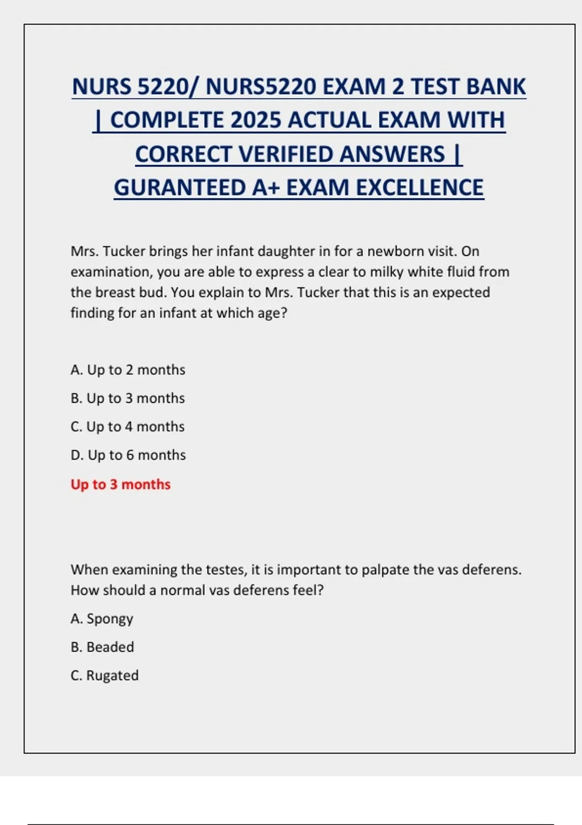 Access the complete NURS 5220 Exam 2 test bank for 2025. Includes actual exam questions with verified answers, guaranteed A+ results. Ideal for nursing students preparing for certification and course exams.