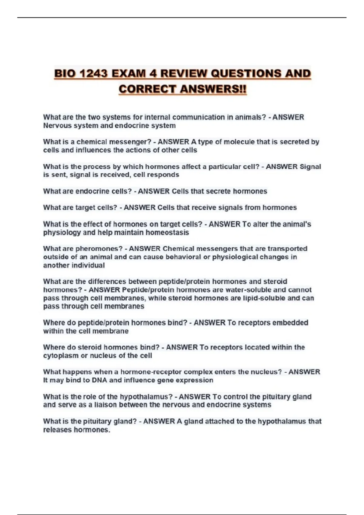 BIO 1243 EXAM 4 REVIEW QUESTIONS AND CORRECT ANSWERS!!...