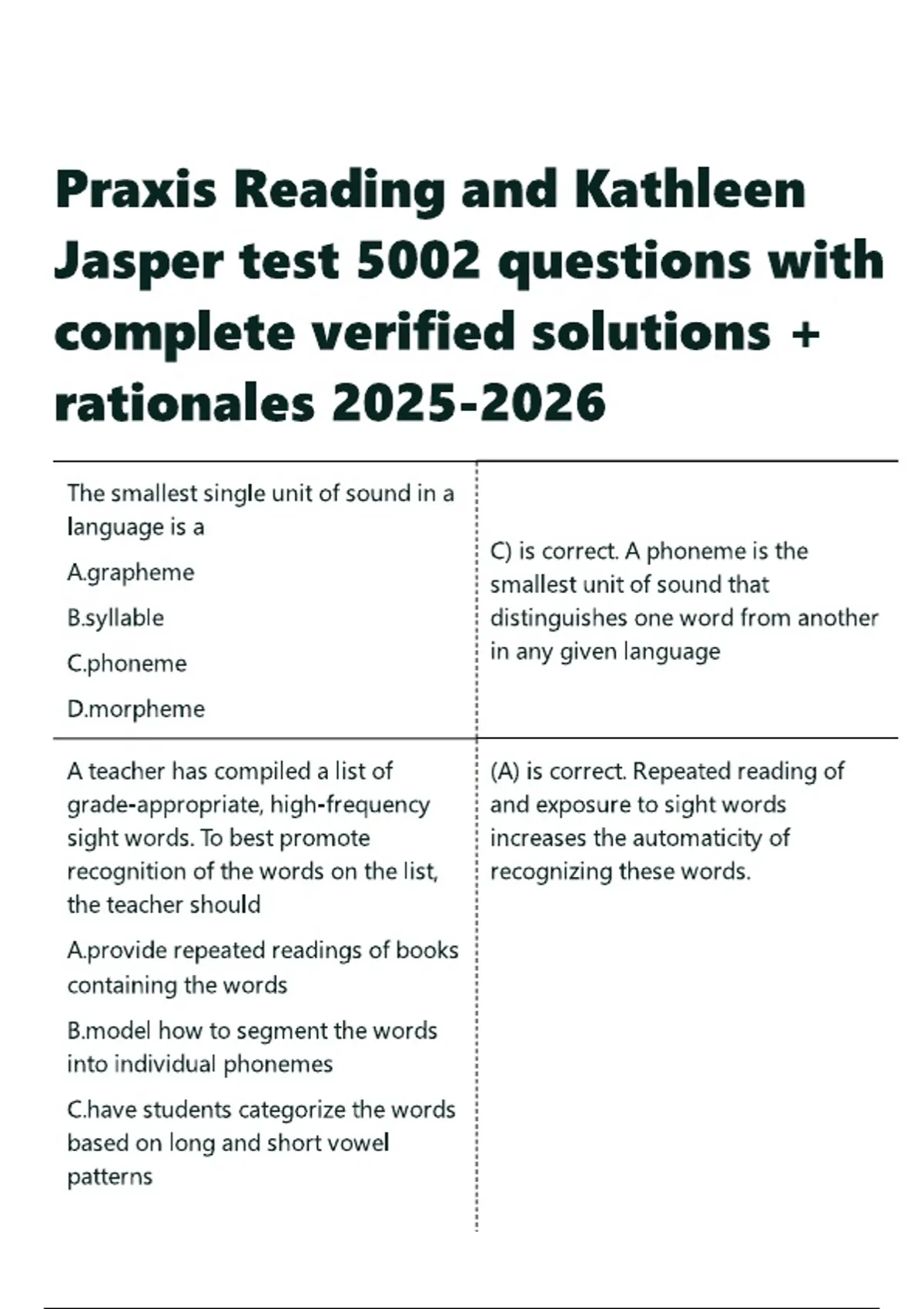 Praxis Reading and Kathleen Jasper test 5002 questions with complete verified solutions +