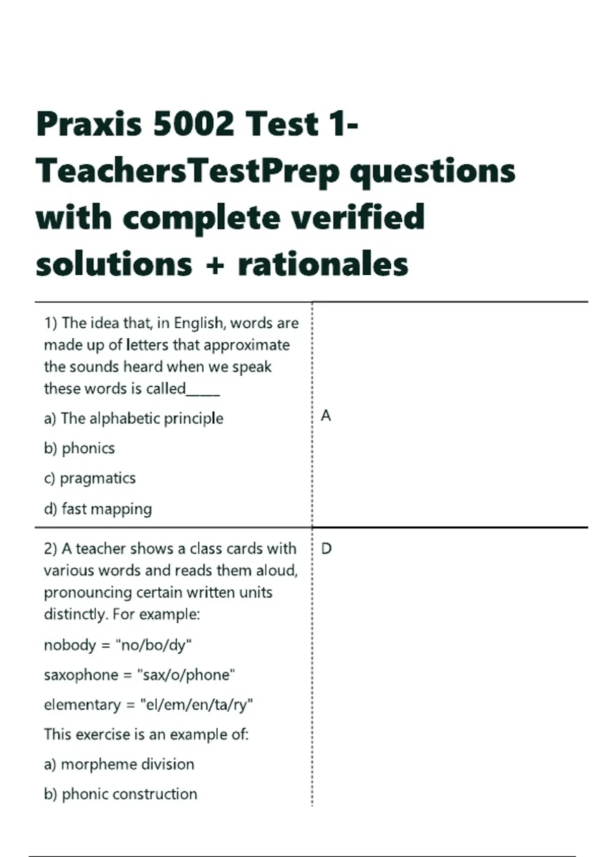 Praxis 5002 Test 1-TeachersTestPrep questions with complete verified solutions + rationales.