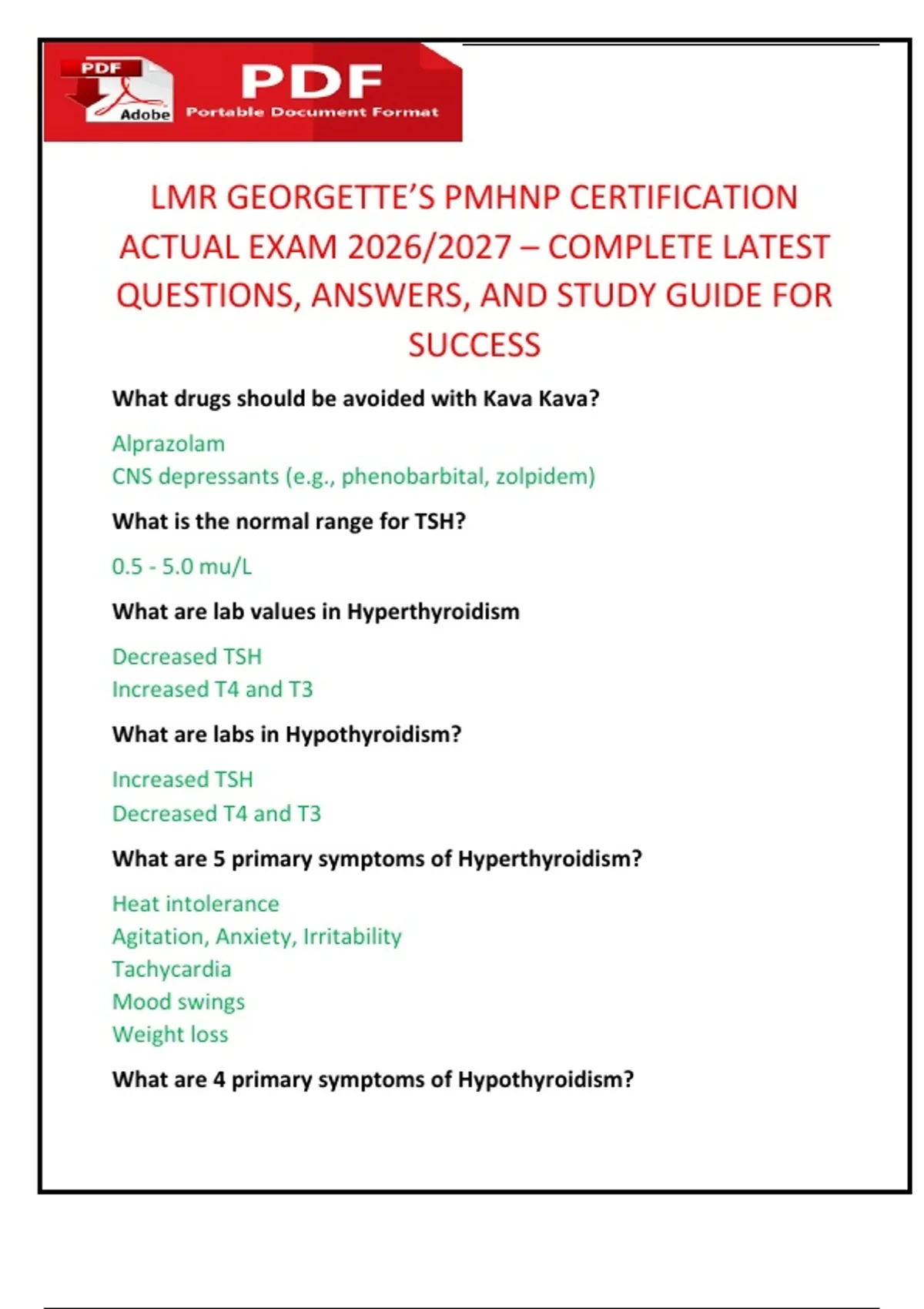 LMR Georgette’s PMHNP Certification Actual Exam 2026/2027 – Complete Latest Questions, Answers, and Study Guide for Success Description Achieve success on the Psychiatric-Mental Health Nurse Practitioner (PMHNP) Certification Exam with LMR Georgette’s PMHNP 2026/2027 Actual Exam Study Guide. This fully updated resource provides a realistic exam experience with the latest content aligned to the 2026/2027 PMHNP certification blueprint. Features include: Complete set of verified exam questions reflecting current PMHNP content Correct answers with detailed explanations for evidence-based learning Comprehensive coverage of all PMHNP core domains, including: Psychiatric assessment and diagnosis Psychotherapy modalities Psychopharmacology and treatment planning Mental health care across the lifespan Clinical decision-making and patient management High-yield study guide tips to maximize retention and exam readiness Ideal for graduate nursing students, PMHNP candidates, and practicing nurse practitioners, this guide ensures confidence, mastery of core concepts, and success on the 2026/2027 PMHNP Certification Exam. What drugs should be avoided with Kava Kava? Alprazolam CNS depressants (e.g., phenobarbital, zolpidem) What is the normal range for TSH? 0.5 - 5.0 mu/L What are lab values in Hyperthyroidism Decreased TSH Increased T4 and T3 What are labs in Hypothyroidism? Increased TSH Decreased T4 and T3 What are 5 primary symptoms of Hyperthyroidism? Heat intolerance Agitation, Anxiety, Irritability Tachycardia Mood swings Weight loss What are 4 primary symptoms of Hypothyroidism?