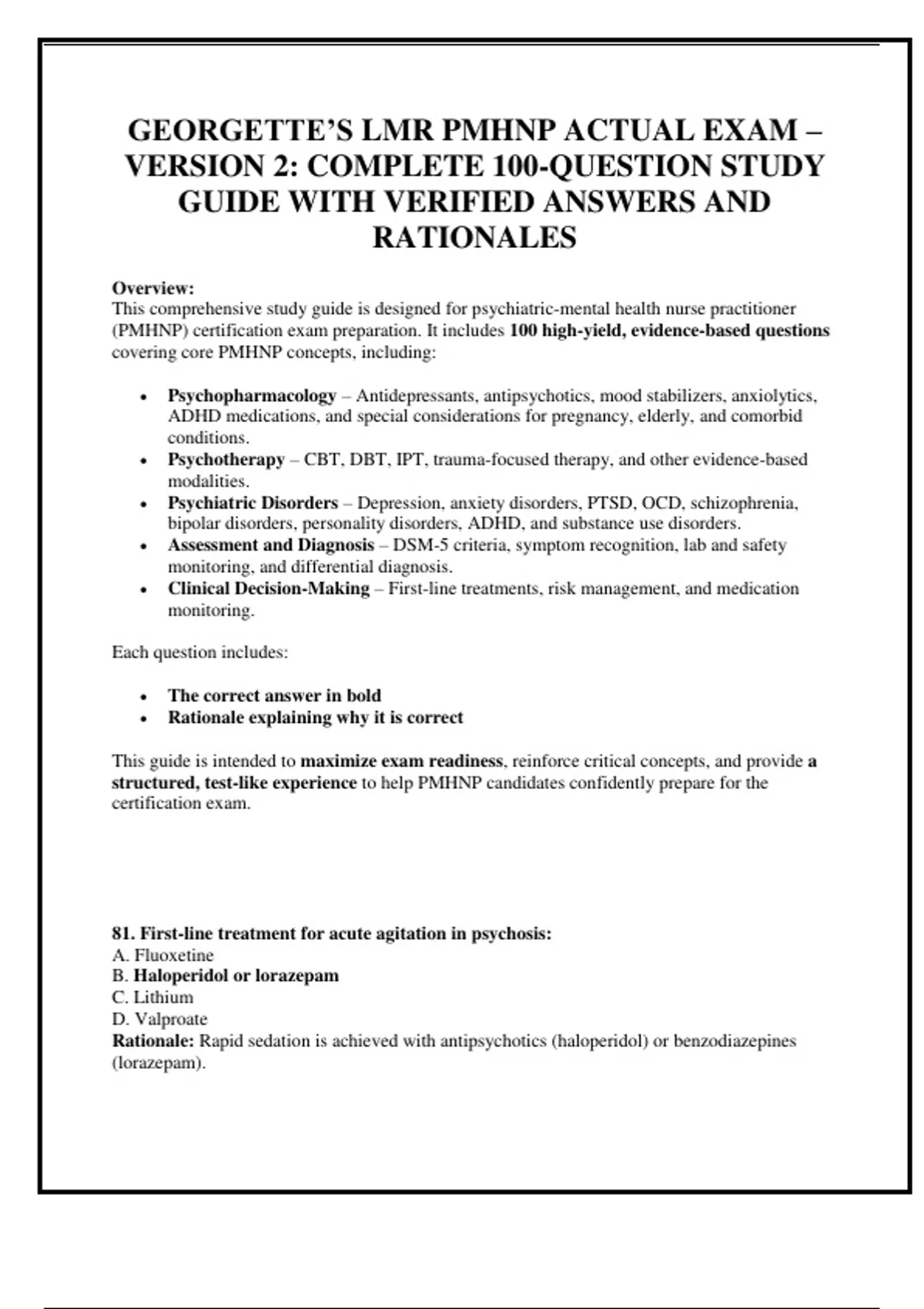 GEORGETTE’S LMR PMHNP ACTUAL EXAM – VERSION 2: COMPLETE 100-QUESTION STUDY GUIDE WITH VERIFIED ANSWERS AND RATIONALES