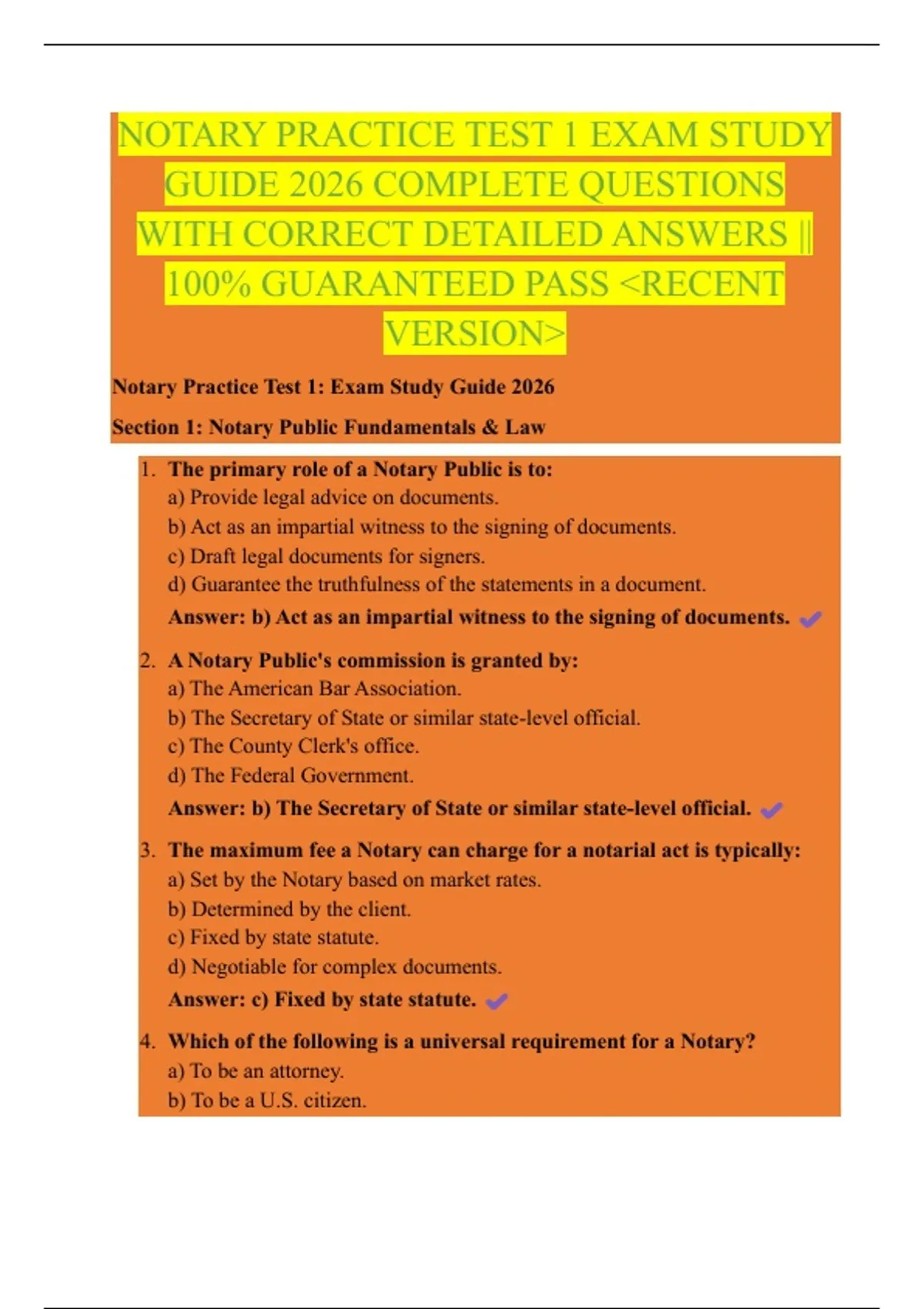 NOTARY PRACTICE TEST 1 EXAM STUDY GUIDE 2026 COMPLETE QUESTIONS WITH CORRECT DETAILED ANSWERS || 100% GUARANTEED PASS <RECENT VERSION>