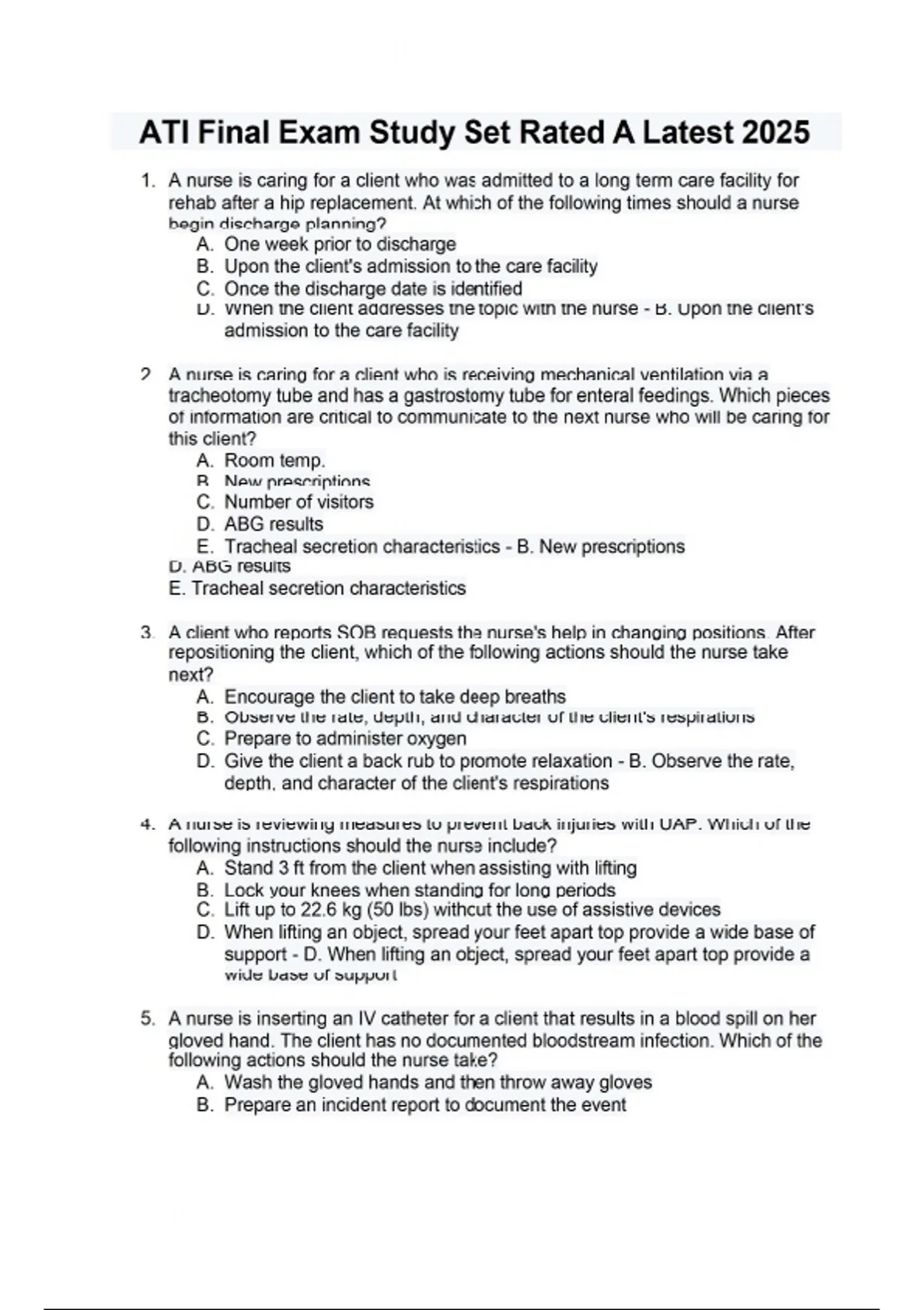 1. A nurse is caring for a client who was admitted to a long term care facility for rehab after a hip replacement. At which of the following times should a nurse begin discharge planning? A. One week prior to discharge B. Upon the client's admission to the care facility C. Once the discharge date is identified D. When the client addresses the topic with the nurse - B. Upon the client's admission to the care facility 2. A nurse is caring for a client who is receiving mechanical ventilation via a tracheotomy tube and has a gastrostomy tube for enteral feedings. Which pieces of information are critical to communicate to the next nurse who will be caring for this client? A. Room temp. B. New prescriptions C. Number of visitors D. ABG results E. Tracheal secretion characteristics - B. New prescriptions D. ABG results E. Tracheal secretion characteristics 3. A client who reports SOB requests the nurse's help in changing positions. After repositioning the client, which of the following actions should the nurse take next? A. Encourage the client to take deep breaths B. Observe the rate, depth, and character of the client's respirations C. Prepare to administer oxygen D. Give the client a back rub to promote relaxation - B. Observe the rate, depth, and character of the client's respirations 4. A nurse is reviewing measures to prevent back injuries with UAP. Which of the following instructions should the nurse include? A. Stand 3 ft from the client when assisting with lifting B. Lock your knees when standing for long periods C. Lift up to 22.6 kg (50 lbs) without the use of assistive devices D. When lifting an object, spread your feet apart top provide a wide base of support - D. When lifting an object, spread your feet apart top provide a wide base of support 5. A nurse is inserting an IV catheter for a client that results in a blood spill on her gloved hand. The client has no documented bloodstream infection. Which of the following actions should the nurse take? A. Wash the gloved hands and then throw away gloves B. Prepare an incident report to document the event C. Carefully remove the gloves and proceed with hand hygiene D. Ask the provider to order a blood culture to determine the risk of infection - C. Carefully remove the gloves and proceed with hand hygiene 6. A community health nurse is conducting a class about body mechanics for county office workers. Which of the following instructions should the nurse include? A. Sit with your back supported B. Keep your knees at hip level C. Use an ergonomically designed computer keyboard D. Keep your elbows away from your body E. Adjust the monitor screen so that you have to tilt your head slightly to look at it - A. Sit with your back supported B. Keep your knees at hip level C. Use an ergonomically designed computer keyboard 7. A nurse is conducting an admission interview with a client. Which of the following pieces of assessment info should the nurse collect during the introductory phase of the interview? A. Client's level of comfort and ability to participate in the interview B. Previous illnesses and surgeries C. Events surrounds the client's recent illness D. Sociocultural history - A. Client's level of comfort and ability to participate in the interview 8. A nurse is assessing a client who is undergoing a physical exam. Following the inspection, which of the following techniques should the nurse use when assessing the client's abdomen? A. Auscultation B. Light Palpation C. Percussion D. Deep palpation - A. Auscultation 9. A nurse is employing a thorough, systematic method while obtaining objective data about a client. Through which of the following methods should the nurse collect this info? A. Health History B. Physical Exam C. Review of Systems D. Interview - B. Physical Exam 10. A nurse is teaching a client about lifestyle changes to manage a chronic illness. Which of the following strategies should the nurse use to first help the client make a commitment to these lifestyle changes? A. Identify the risks of nonadherence B. Schedule learning sessions to demonstrate the psychomotor skills the client will need C. Provide clearly written and easy-to-understand materials D. Help the client identify ways that these changes will result in positive personal outcomes - D. Help the client identify ways that these changes will result in positive personal outcomes