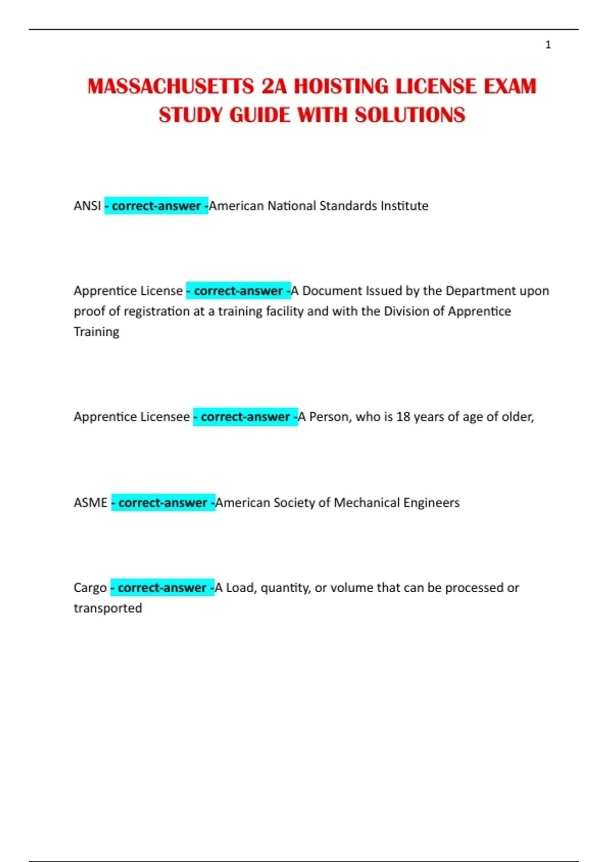 MASSACHUSETTS 2A HOISTING LICENSE EXAM STUDY GUIDE WITH SOLUTIONS