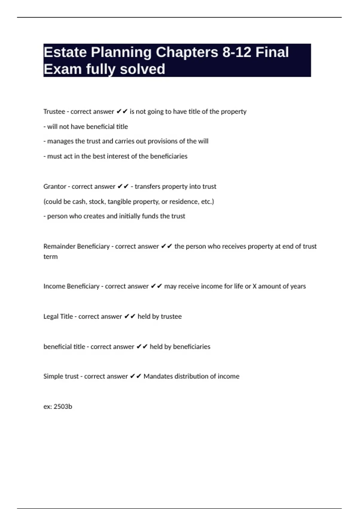 Remainder Beneficiary - correct answer ✔✔ the person who receives property at end of trust