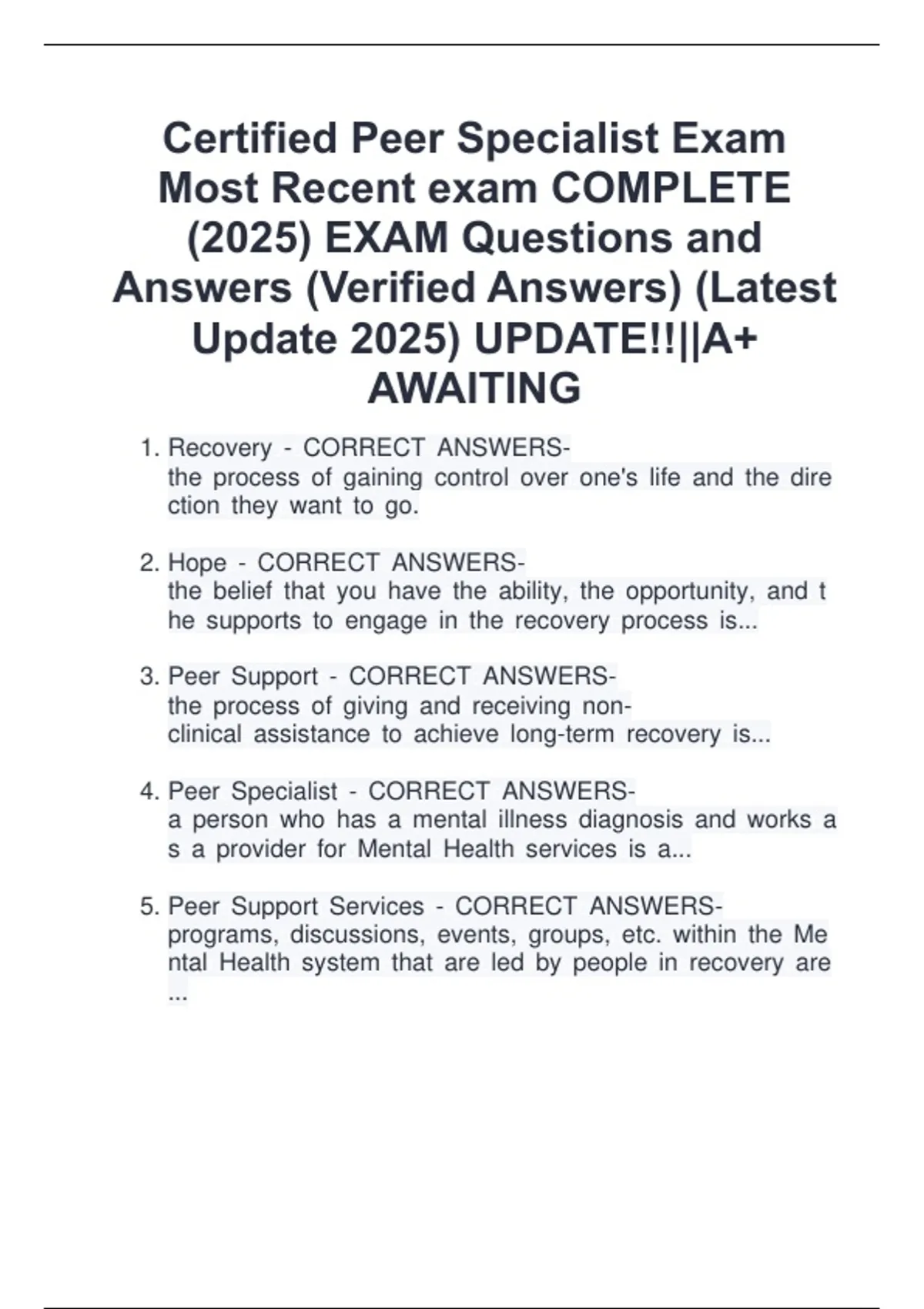 Certified Peer Specialist Exam Most Recent exam COMPLETE (2025) EXAM Questions and Answers (Verified Answers) (Latest Update 2025) UPDATE!!||A+ AWAITING