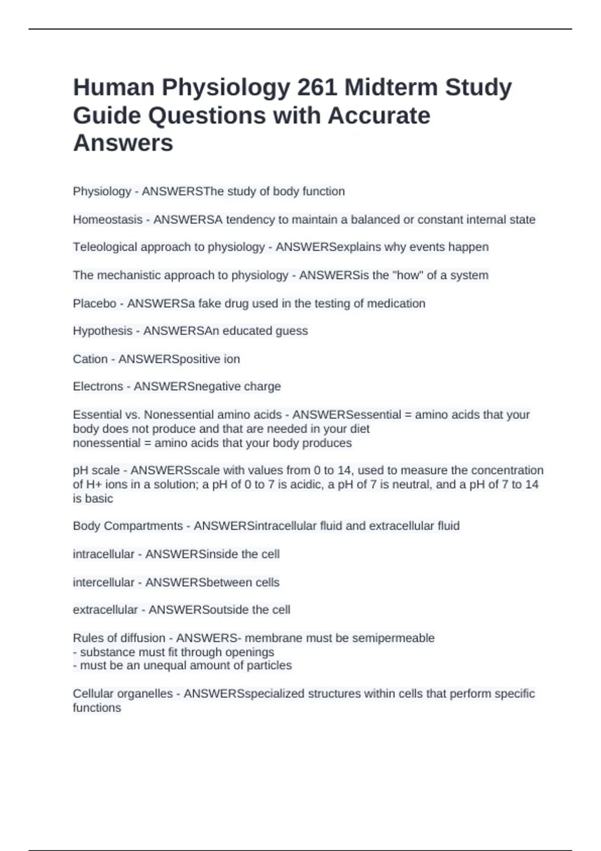 Human Physiology 261 Midterm Study Guide Questions with Accurate Answers