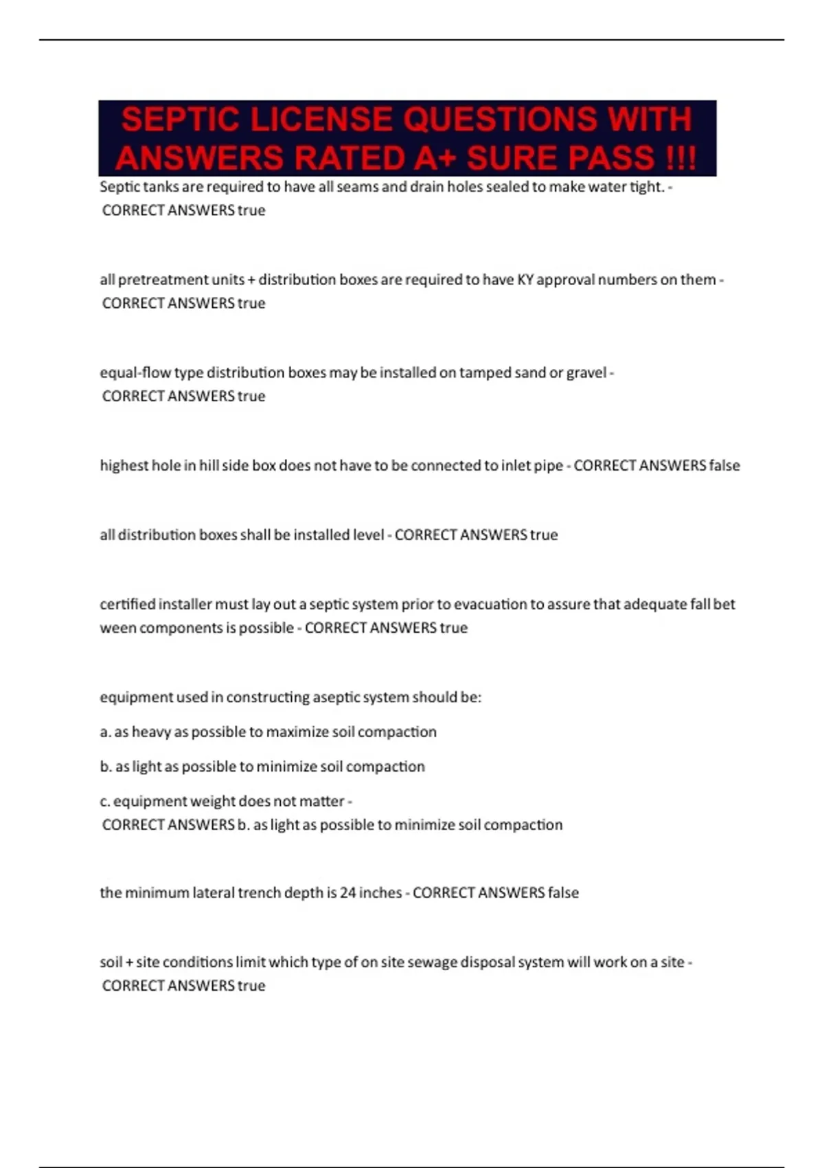 SEPTIC LICENSE QUESTIONS WITH ANSWERS RATED A+ SURE PASS !!!