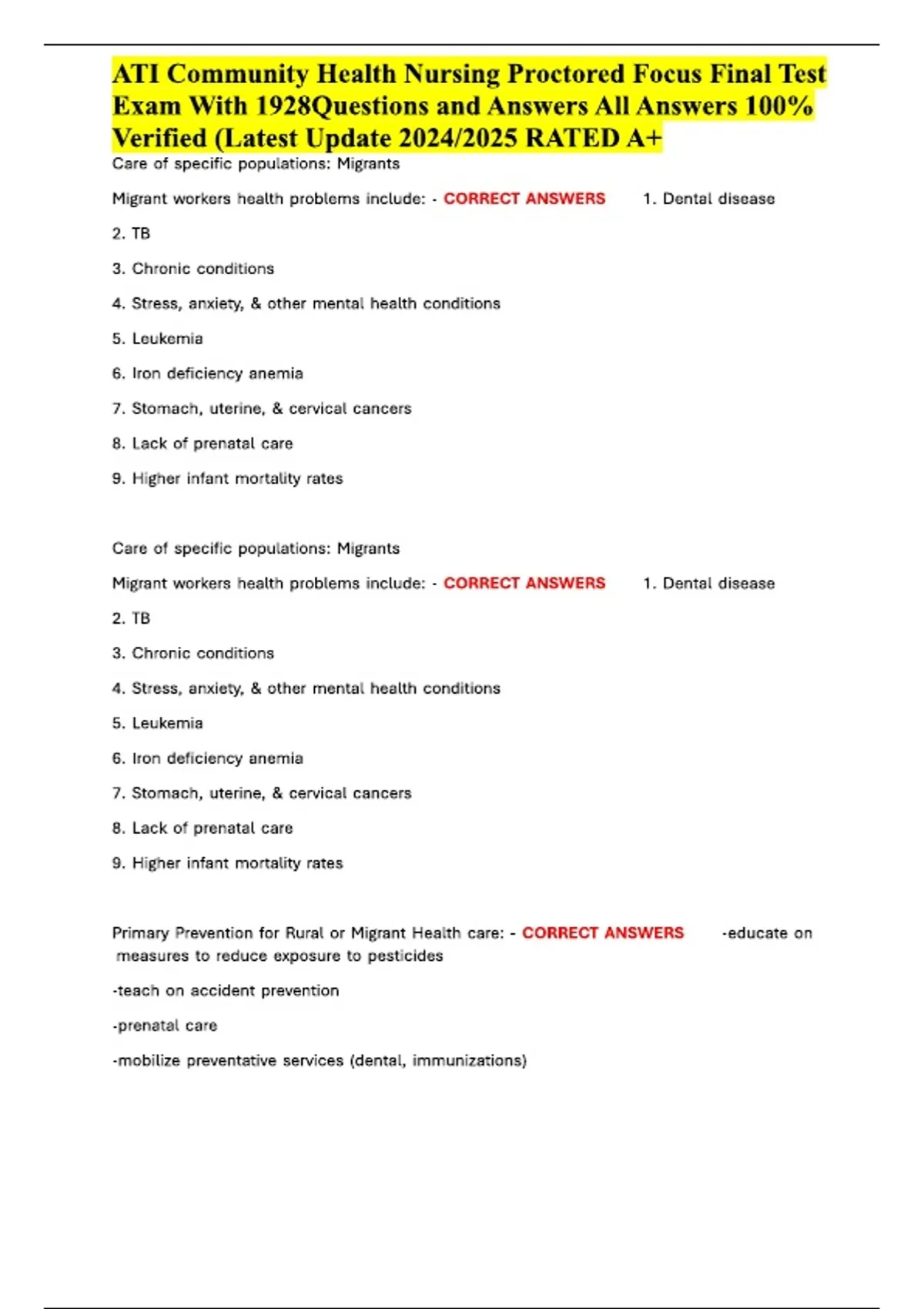 This comprehensive study guide provides 1928 verified questions and answers for the ATI Community Health Nursing Proctored Focus Final Test Exam, updated for the 2024/2025 academic year and graded A+. It is the ultimate resource for nursing students preparing to successfully complete their community health course. Key areas covered include the care of specific populations (e.g., migrants, homeless, elderly), primary, secondary, and tertiary prevention strategies, epidemiology and communicable diseases, environmental health, and the role of the nurse in community assessment and health program planning. This material is essential for exam success and mastery of public health nursing principles.