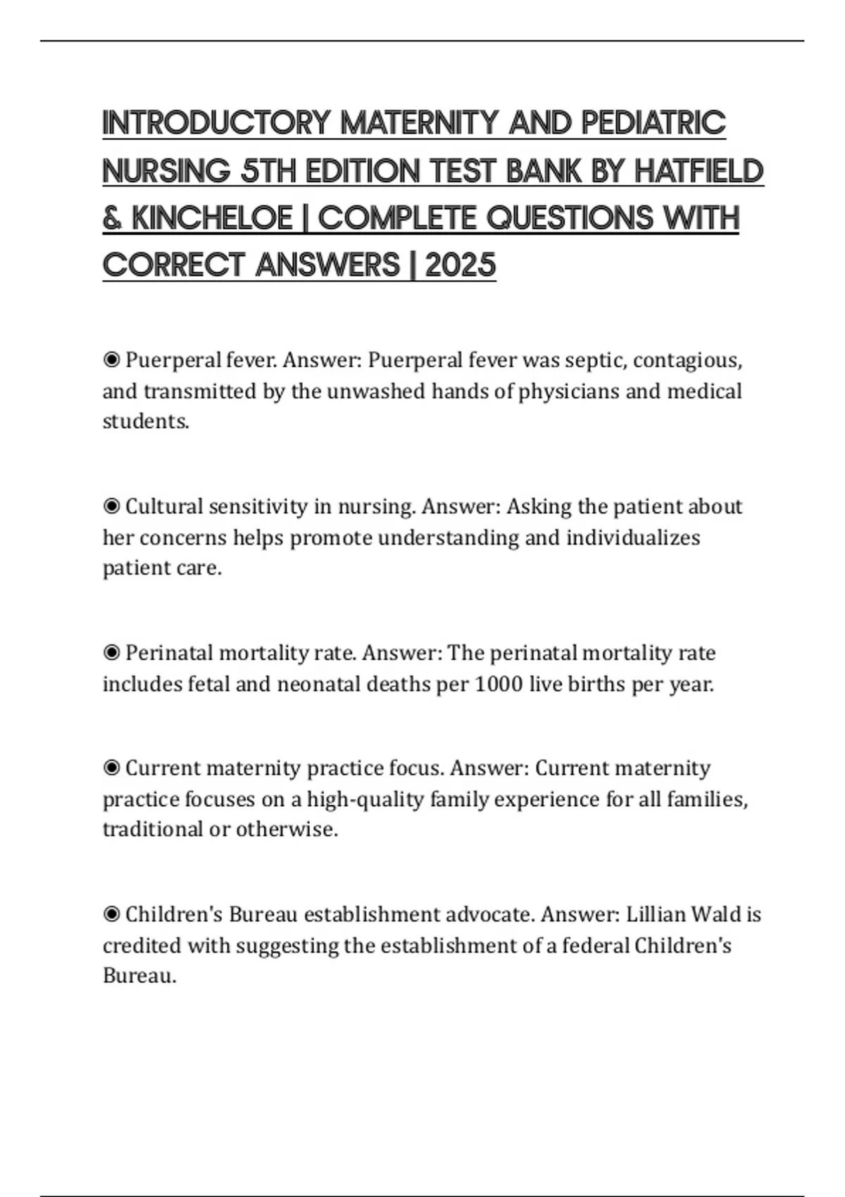 INTRODUCTORY MATERNITY AND PEDIATRIC NURSING 5TH EDITION TEST BANK BY HATFIELD & KINCHELOE | COMPLETE QUESTIONS WITH CORRECT ANSWERS | 2025