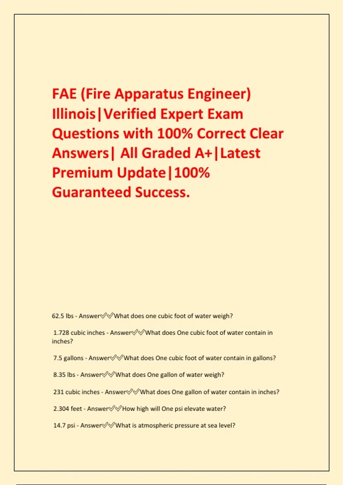 FAE (Fire Apparatus Engineer) Illinois|Verified Expert Exam Questions with 100% Correct Clear Answers| All Graded A+|Latest Premium Update|100% Guaranteed Success. 62.5 lbs - AnswerWhat does one cubic foot of water weigh? 1.728 cubic inches - AnswerWhat does One cubic foot of water contain in inches? 7.5 gallons - AnswerWhat does One cubic foot of water contain in gallons? 8.35 lbs - AnswerWhat does One gallon of water weigh? 231 cubic inches - AnswerWhat does One gallon of water contain in inches? 2.304 feet - AnswerHow high will One psi elevate water? 14.7 psi - AnswerWhat is atmospheric pressure at sea level?