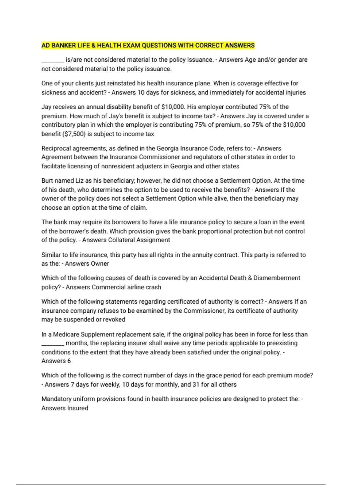 AD BANKER LIFE & HEALTH EXAM QUESTIONS WITH CORRECT ANSWERS