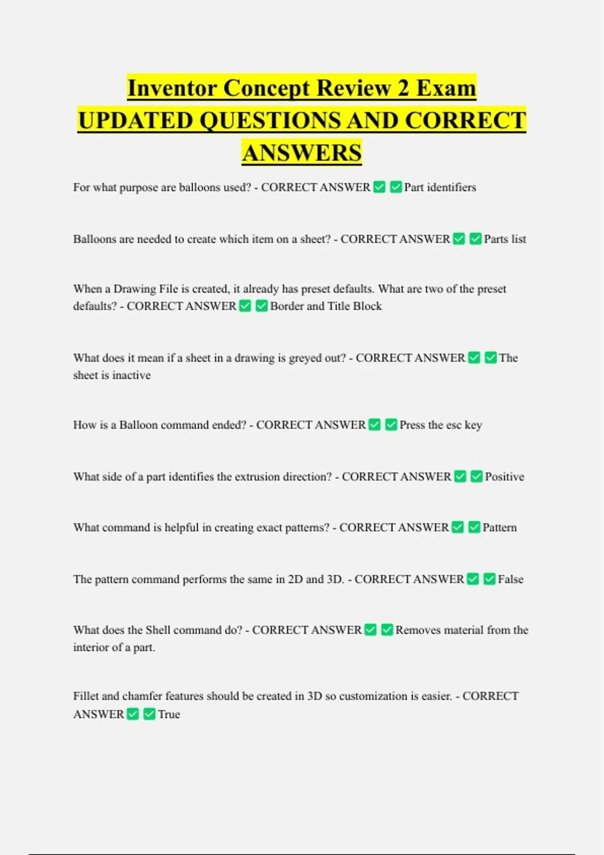 Inventor Concept Review 2 Exam UPDATED QUESTIONS AND CORRECT ANSWERS For what purpose are balloons used? - CORRECT ANSWER Part identifiers Balloons are needed to create which item on a sheet? - CORRECT ANSWER Parts list When a Drawing File is created, it already has preset defaults. What are two of the preset defaults? - CORRECT ANSWER Border and Title Block What does it mean if a sheet in a drawing is greyed out? - CORRECT ANSWER sheet is inactive How is a Balloon command ended? - CORRECT ANSWER Press the esc key What side of a part identifies the extrusion direction? - CORRECT ANSWER What command is helpful in creating exact patterns? - CORRECT ANSWER The pattern command performs the same in 2D and 3D. - CORRECT ANSWER What does the Shell command do? - CORRECT ANSWER The Positive Pattern False