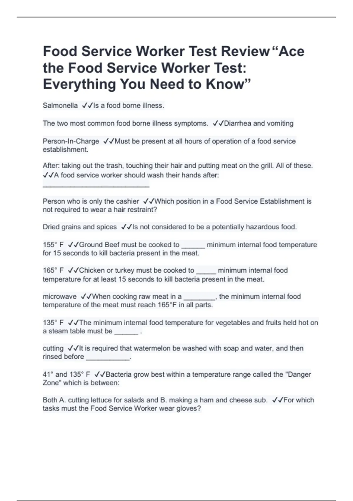 Food Service Worker Test Review “Ace
