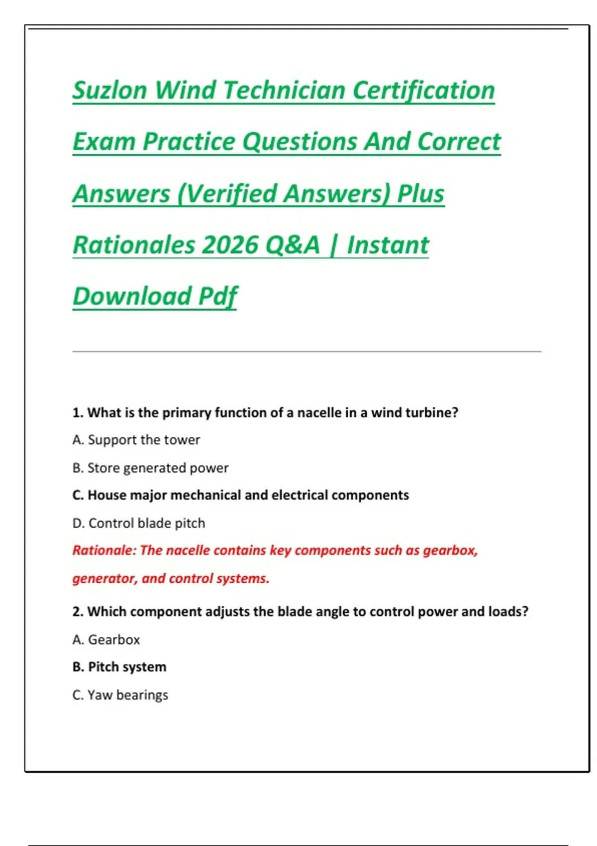 Suzlon Wind Technician Certification Exam Practice Questions And Correct Answers (Verified Answers) Plus Rationales 2026 Q&A | Instant Download Pdf