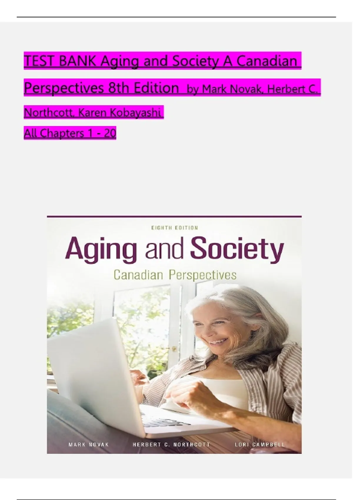 Test Bank for Aging and Society: A Canadian Perspectives, 8th Edition by Mark Novak, Herbert C. Northcott, and Karen Kobayashi.