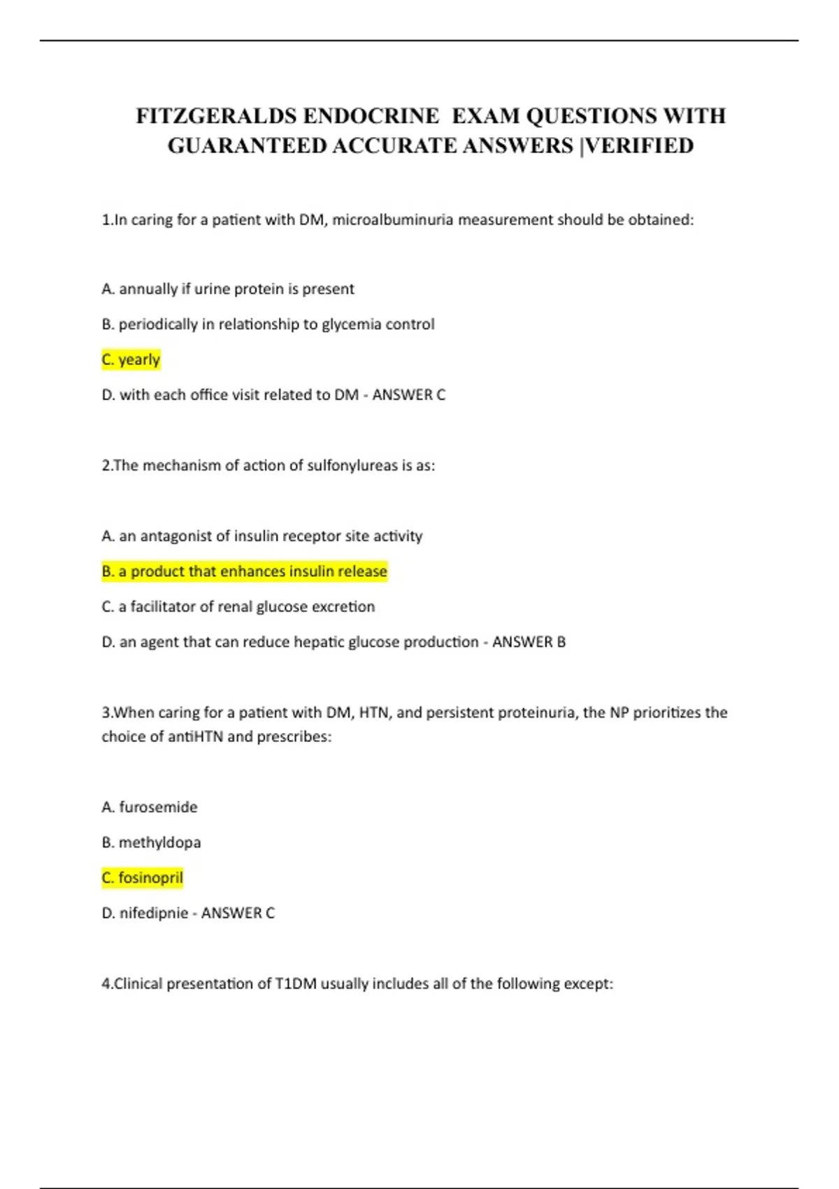 1.In caring for a patient with DM, microalbuminuria measurement should be obtained: A. annually if urine protein is present B. periodically in relationship to glycemia control C. yearly D. with each office visit related to DM - ANSWER C 2.The mechanism of action of sulfonylureas is as: A. an antagonist of insulin receptor site activity B. a product that enhances insulin release C. a facilitator of renal glucose excretion D. an agent that can reduce hepatic glucose production - ANSWER B 3.When caring for a patient with DM, HTN, and persistent proteinuria, the NP prioritizes the choice of antiHTN and prescribes: A. furosemide B. methyldopa C. fosinopril D. nifedipnie - ANSWER C 4.Clinical presentation of T1DM usually includes all of the following except: A. report of recent unintended weight gain B. ketosis C. thirst D. polyphagia - ANSWER A 5.Which of the following should be periodically monitored with the use of a biguanide? A. creatinine kinase CK B. alkaline phosphatase ALP C. alanine aminiotransferase ALT D. creatinine Cr - ANSWER D 6.Which of the following should be periodically monitored with the use of a thiazolidinedione? A. CK B. ALP C. ALT D. Cr - ANSWER C 7.All of the following are risks for lactic acidosis in individuals taking metformin except: A. presence of chronic renal insufficiency B. acute dehydration C. radiographic contrast dye use D. history of allergic reaction to sulfonamides - ANSWER D 8.Secondary causes of hyperglycemia potentially include the use of all of the following medications except: A. high dose niacin B. systemic corticosteroids C. high dose thiazide diuretics D. low dose angiotensin receptor blockers - ANSWER D 9.Which of the following characteristics applies to T1DM? A. Significant hyperglycemia and ketoacidosis result from lack of insulin B. This condition is commonly diagnosed on routine exam for other health problems. C. Initial response to oral sulfonylureas is usually favorable D. Insulin resistance is a significant part of the disease. - ANSWER A 10.Which of the following characteristics applies to T2DM? A. Major risk factors are hereditary and obesity. B. Pear shaped body type is commonly found. C. Exogenous insulin is needed for control disease. D. Physical activity enhances IR. - ANSWER A 11.You consider prescribing insulin glargine (Lantus) because of its: A. extended duration of action B. rapid onset of action C. ability to prevent diabetic end organ damage D. ability to preserve pancreatic function - ANSWER A