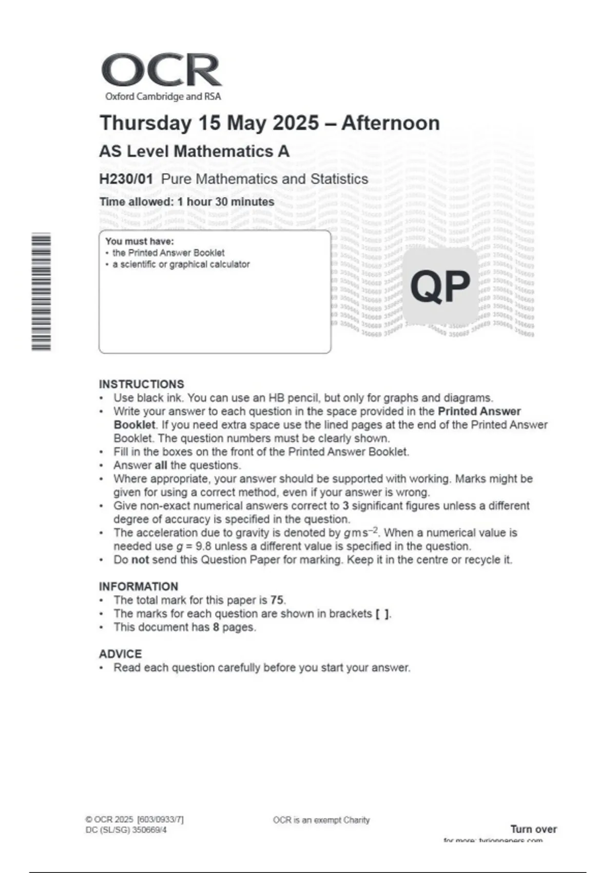 OCR AS Level Mathematics A H230/01 Pure Mathematics and Statistics June 2025