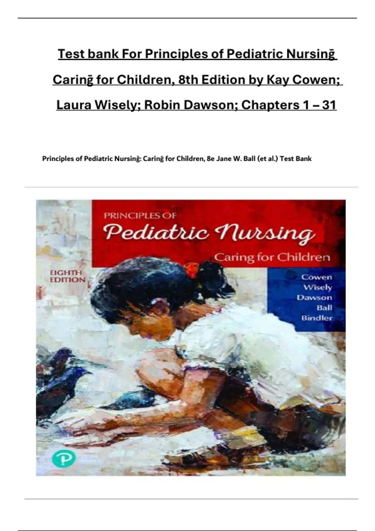 This course provides an in-depth exploration of pediatric nursing concepts based on Principles of Pediatric Nursing: Caring for Children (8th Edition) by Cowen, Wisely, and Dawson. Covering chapters 1–31, it focuses on the nursing care of infants, children, and adolescents within the context of their families and communities. Emphasis is placed on growth and development, health promotion, disease prevention, and the management of common pediatric disorders. Through case-based test questions, clinical reasoning exercises, and evidence-based learning, students will develop the knowledge and skills necessary to deliver safe, compassionate, and family-centered nursing care to children across all developmental stages.