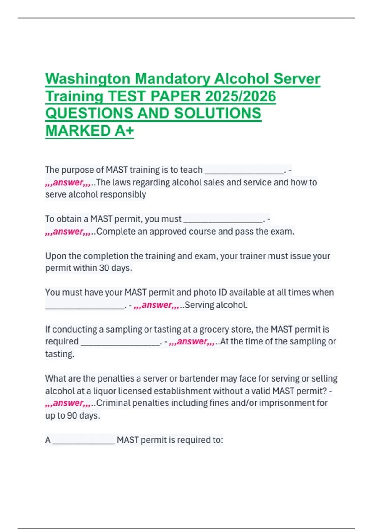 Washington Mandatory Alcohol Server Training TEST PAPER 2025/2026 QUESTIONS AND SOLUTIONS MARKED A+ The purpose of MAST training is to teac