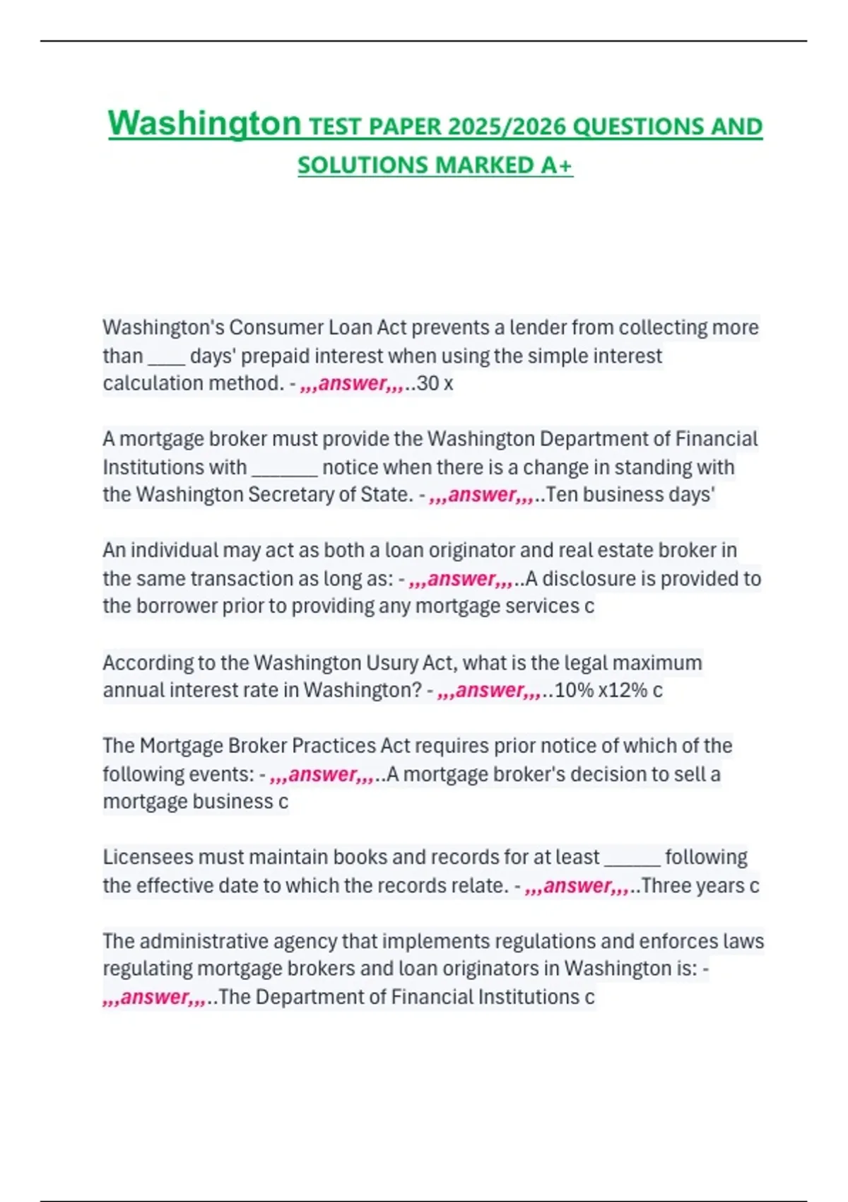 Washington TEST PAPER 2025/2026 QUESTIONS AND SOLUTIONS MARKED A+ Washington's Consumer Loan Act prevents a lender from collecting more than