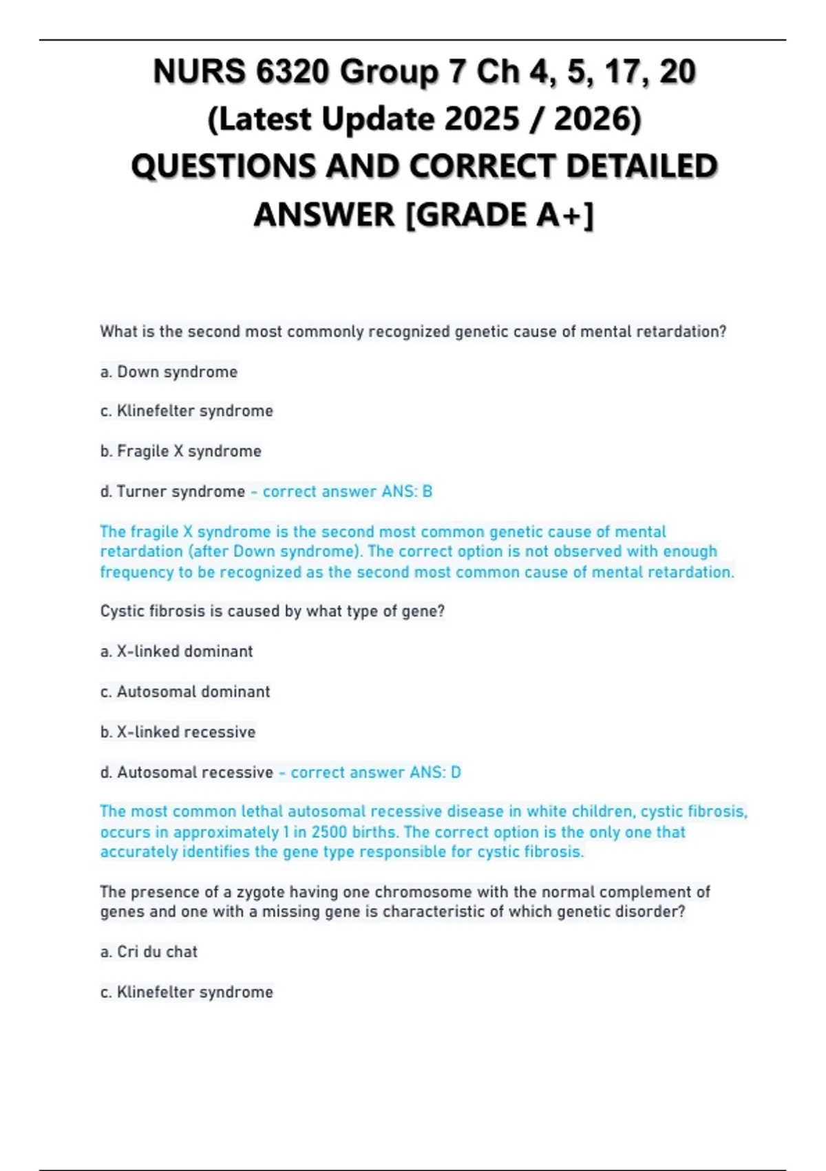 d. Turner syndrome - correct answer ANS: A