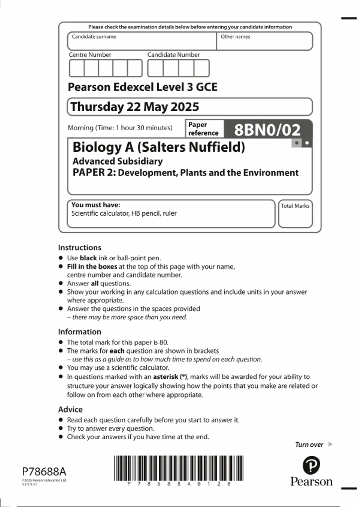 Pearson Edexcel AS Level Biology A Paper 2 2025 (8BN0/02: Development, Plants and the Environment)