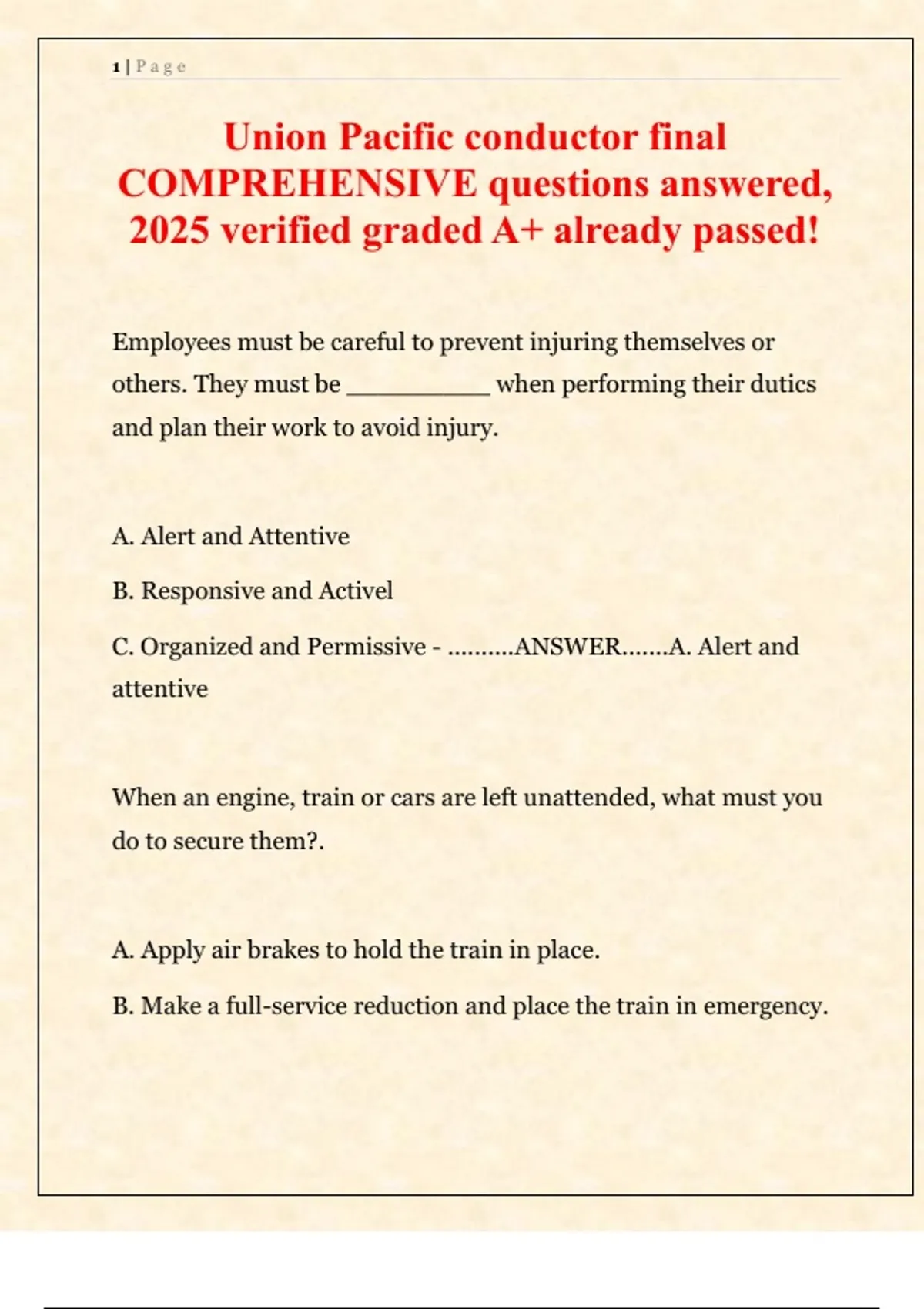 Ace your Union Pacific Conductor Final Exam! This comprehensive 2025 study guide contains a full set of actual exam questions and verified answers, guaranteed to help you pass. This resource is meticulously compiled to cover all critical topics and is already graded A+, reflecting the most current rules and procedures on the UP. What's Inside: Actual Final Exam Questions & Answers: A wide-ranging set of questions that mirror the content and difficulty of the official UP Conductor test. Verified & Detailed Solutions: Understand the reasoning behind every answer for effective learning and retention. Extensive Topic Coverage: GCOR Rules, Air Brake Tests, Signal Indications, Track Warrant Authority, Safety Procedures, and UP-specific protocols. Ideal for Comprehensive Review: Use this guide to test your knowledge, identify weak areas, and build the confidence needed to pass. Key Topics Covered: General Code of Operating Rules (GCOR) Air Brake Tests (Class I, II, III, Transfer) Timetables, Track Bulletins, and General Orders Signal Aspects and Indications (Absolute, Permissive, Interlockings) Yard Limits, Main Track Authority, and Restricted Speed Equipment Inspection & Securement (Hand Brakes, Blue Flags) Hazardous Materials Handling & RSSM Protocols On-Duty Safety (PPE, Hearing Protection, Red Zone) Download now and take the final step toward launching your career as a Union Pacific Conductor!