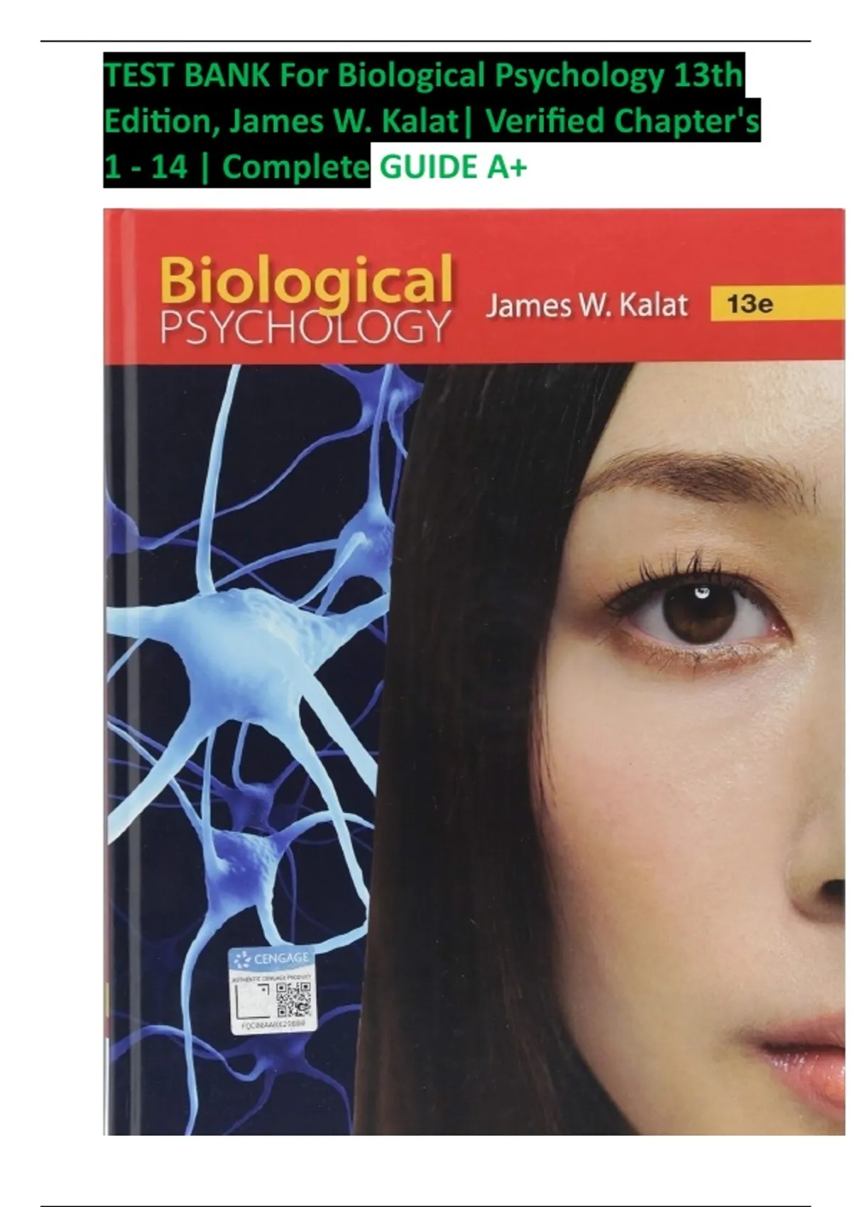 TEST BANK FOR Biological Psychology 13th Edition by James Kalat , ISBN: 9781337408202 |Complete Test Bank| All Chapters Covered, Guide A+