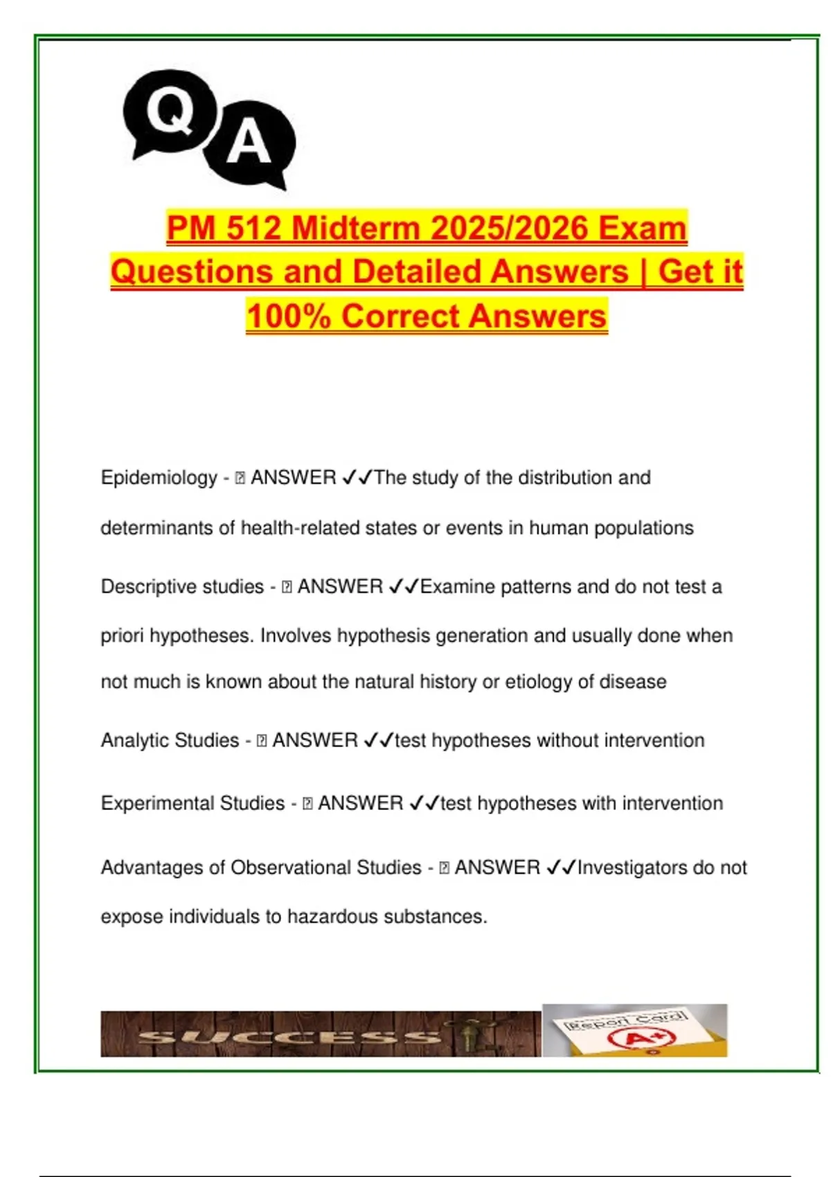 This expertly compiled document contains 100+ exam questions and fully verified answers tailored for the PM 512 Midterm in Public Health and Epidemiology. It provides an in-depth review of the core concepts in epidemiologic research, making it a vital resource for graduate students and professionals preparing for coursework or board exams. Core Topics Include: Epidemiological study types: descriptive, analytic, cohort, case-control, cross-sectional, and ecological Concepts of risk, rate, prevalence, incidence, case fatality, and mortality Causal inference models and criteria Biases in epidemiologic studies: selection bias, information bias, and confounding Prevention levels: primary, secondary, tertiary Randomized controlled trials and phases of clinical trials Survival analysis, censoring, and use of life tables Public health ethics, informed consent, HIPAA, IRB protocols Attributable risk, relative risk, odds ratio, and number needed to treat This midterm guide is ideal for: Graduate-level public health, epidemiology, and biostatistics students Medical students and health professionals needing a structured epidemiology refresher Researchers preparing for certification in clinical trials or population health Public health administrators, analysts, or policy designers seeking to understand population-based health assessment tools Highly aligned with Master’s in Public Health (MPH) programs and USC’s PM 512 curriculum, this document simplifies complex theories with practical definitions, formulas, and examples. Each question is paired with clear, concise answers that adhere to current academic and professional standards. Keywords: PM 512, epidemiology, USC, midterm exam, public health, study design, cohort study, case-control, risk analysis, incidence, prevalence, bias, causal inference, prevention levels, relative risk, odds ratio, HIPAA, IRB, survival analysis, randomized trials, MPH course