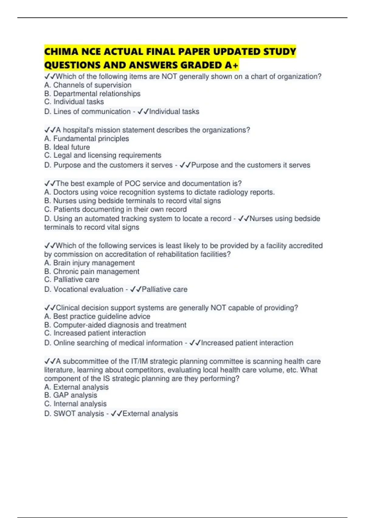 CHIMA NCE ACTUAL FINAL PAPER UPDATED STUDY QUESTIONS AND ANSWERS GRADED A+