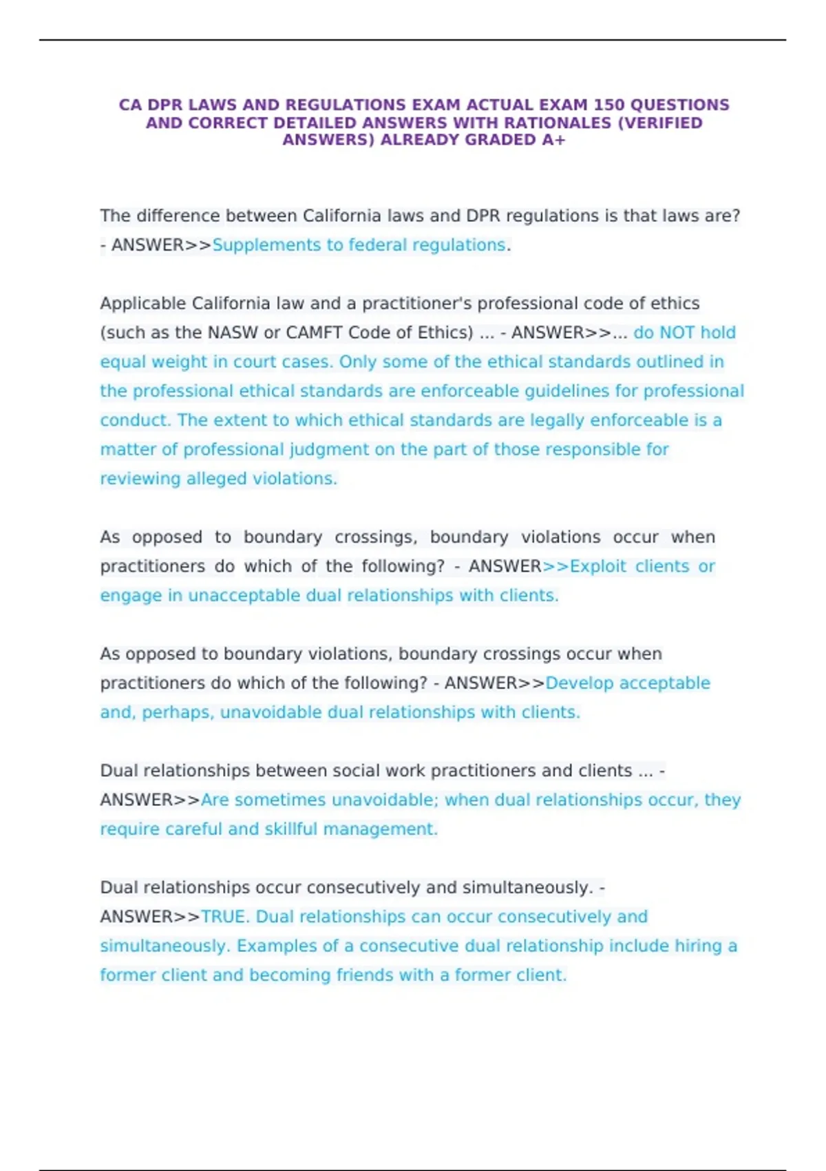 CA DPR LAWS AND REGULATIONS EXAM ACTUAL EXAM 150 QUESTIONS