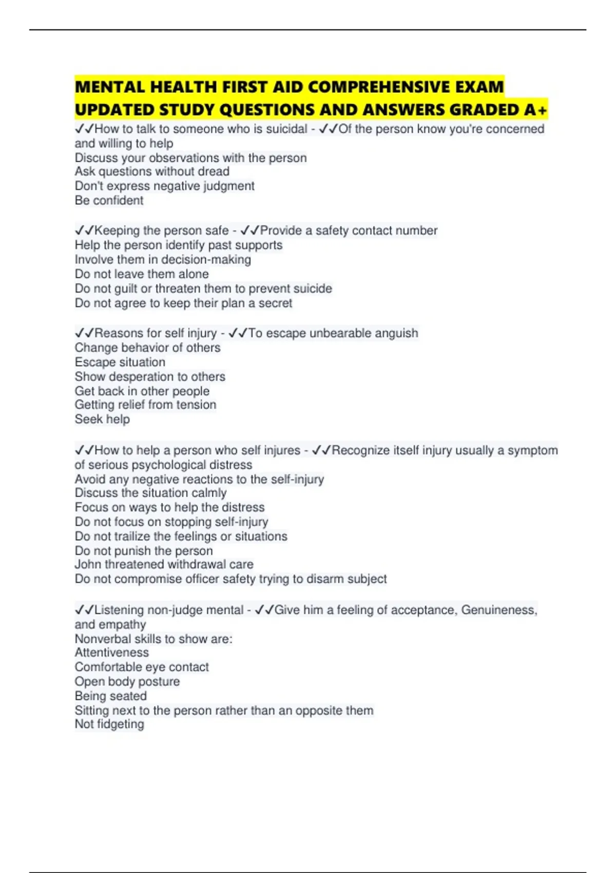 MENTAL HEALTH FIRST AID COMPREHENSIVE EXAM UPDATED STUDY QUESTIONS AND ANSWERS GRADED A+