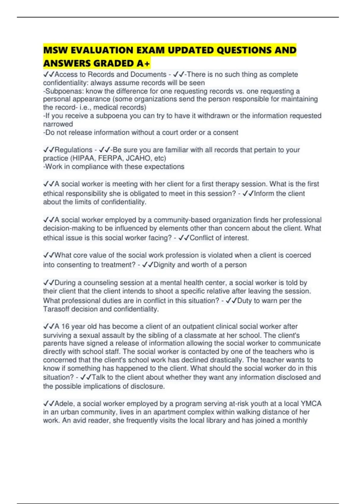 MSW EVALUATION EXAM UPDATED QUESTIONS AND ANSWERS GRADED A+
