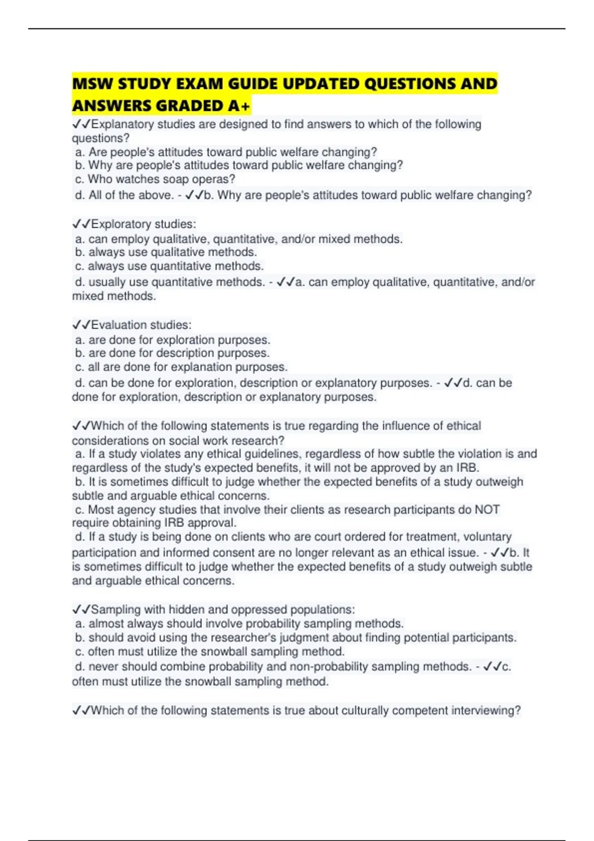 MSW STUDY EXAM GUIDE UPDATED QUESTIONS AND