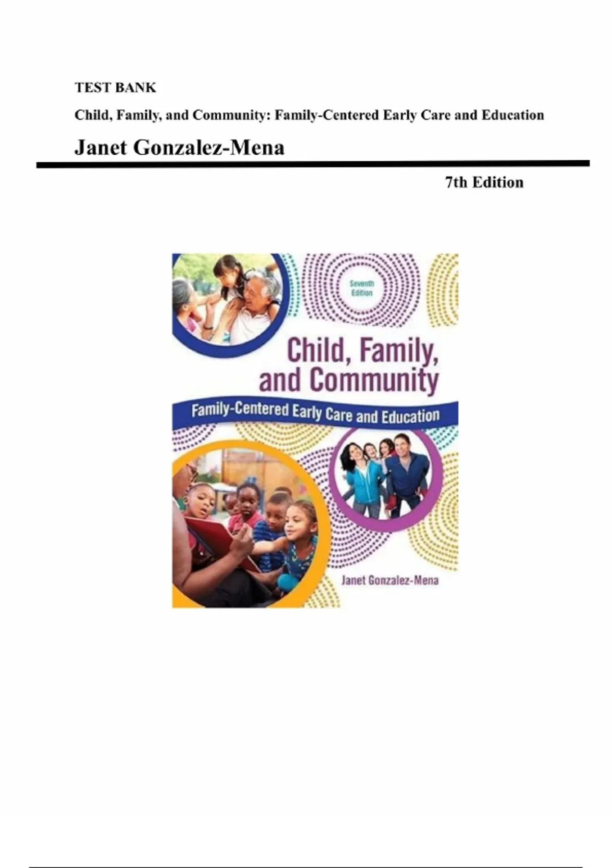 Child, Family, and Community: Family-Centered Early Care and Education, 7th Edition – Janet Gonzalez-Mena | Complete Test Bank (Chapters 1–15)...Chapter 1 The Child in Context of Family and Community, Chapter 2 Supporting Families around Issues of Attachment and Trust, Chapter 3 Supporting Families with Autonomy-Seeking Youngsters, Chapter 4 Sharing Views of Initiative with Families, Chapter 5 Working with Families of School-Age Children, Chapter 6 Societal Influences on Children and Families, Chapter 7 Understanding Families’ Goals, Values, and Culture, Chapter 8 Working with Families on Guidance Issues, Chapter 9 Working with Families on Addressing Feelings and Problem Solving, Chapter 10 Working with Families to Support Self-Esteem, Chapter 11 Working with Families around Gender Issues, Chapter 12 Stress and Success in Family Life, Chapter 13 Early Care and Education Programs as Community Resources, Chapter 14 Supporting Families Through Community Resources and Networks, Chapter 15 Social Policy Issues