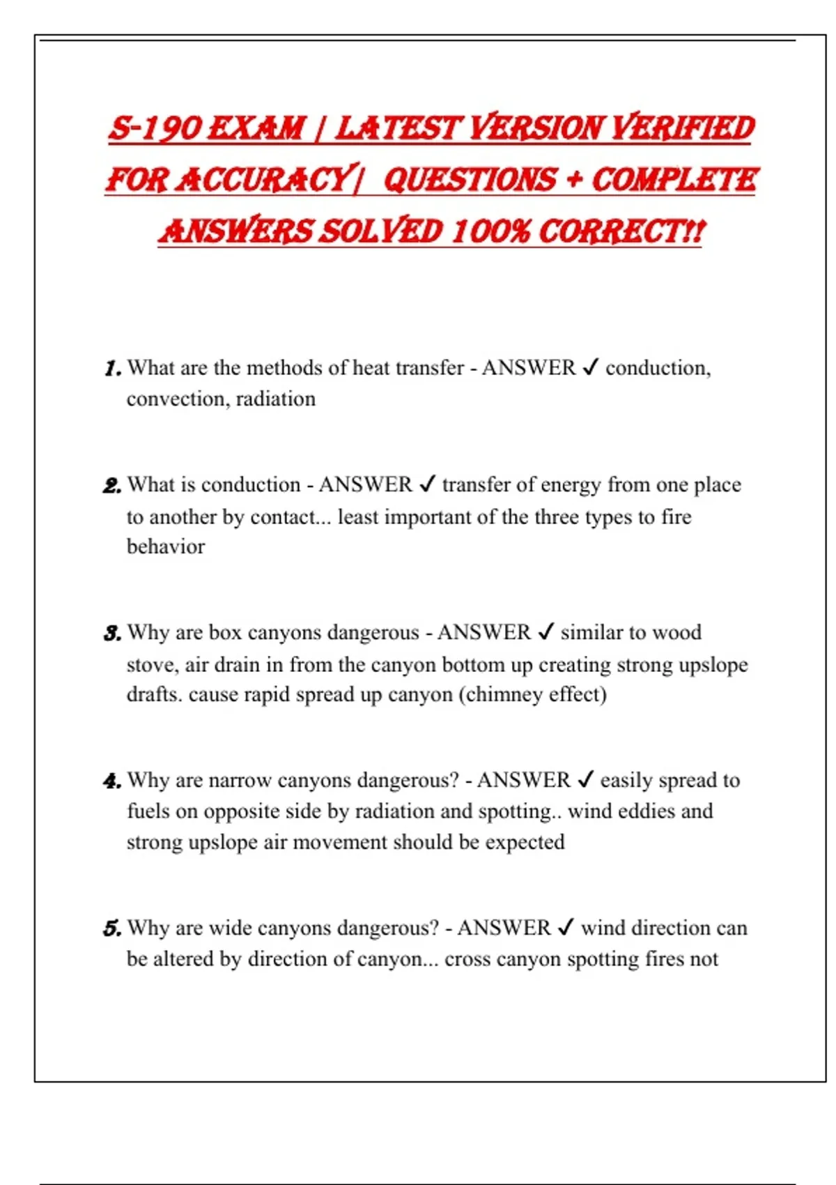 S-190 Exam | latESt vErSion vErifiEd for accuracy| QuEStionS + complEtE anSwErS SolvEd 100% corrEct!! 1. What are the methods of heat transfer - ANSWER conduction, convection, radiation 2. What is conduction - ANSWER transfer of energy from one place to another by contact... least important of the three types to fire behavior 3. Why are box canyons dangerous - ANSWER similar to wood stove, air drain in from the canyon bottom up creating strong upslope drafts. cause rapid spread up canyon (chimney effect) 4. Why are narrow canyons dangerous? - ANSWER easily spread to fuels on opposite side by radiation and spotting.. wind eddies and strong upslope air movement should be expected 5. Why are wide canyons dangerous? - ANSWER wind direction can be altered by direction of canyon... cross canyon spotting fires not uncommon except in high winds... differences in fire behavior will occur on north and south aspects 6. Why are ridges dangerous - ANSWER may change direction when reach a point at drop off (caused by air flow from canyon) 7. What is a saddle - ANSWER A saddle is a common name for a depression between two adjacent hilltops... wind can increase in speed as it passes through the constricted area and spreads out on downwind side with possibility of eddy 8. Elevation influence - ANSWER (ASL- above sea level) lower elevations: higher temps and fuels dry out earlier in the year... high elevation may have no fuels... elevation affects the amount of precipitation, wind exposure, relationship to the surrounding terrain 9. What are some natural and man made barriers - ANSWER rocks, rivers, roads, fireline, reservoirs 10. What are the six fuel types - ANSWER grass (hottest/fastest.. desert/range areas... 1 hour fuels), grass-shrubs (plains/high deserts), shrub, timber-understory (ladder to crown fuels), timber litter (common in mountains in NW), slash-blowdown (after natural or human activities)