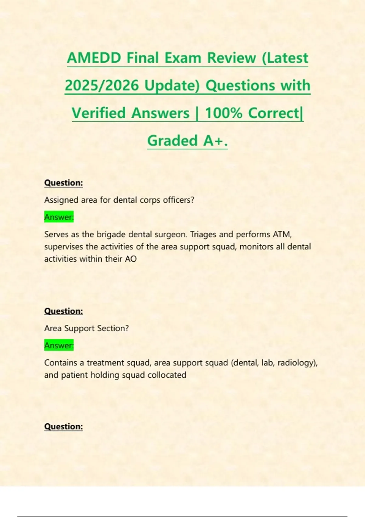 AMEDD Final Exam Review (Latest 2025/2026 Update) Questions with Verified Answers | 100% Correct| Graded A+.