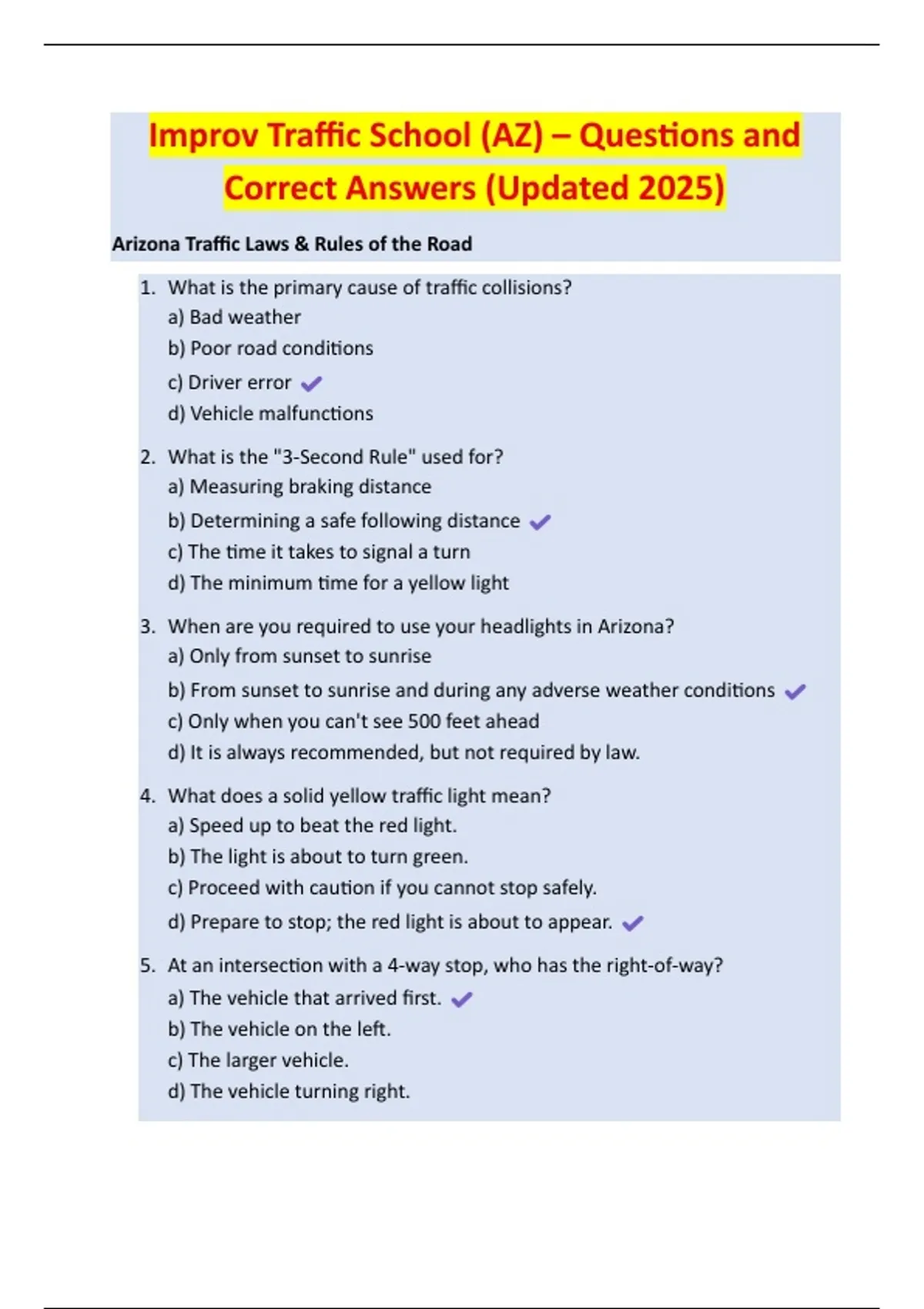 Improv Traffic School (AZ) – Questions and Correct Answers (Updated 2025)