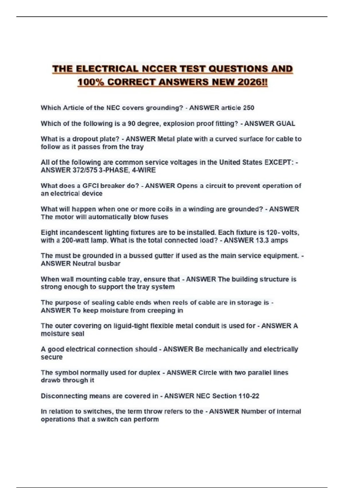 THE ELECTRICAL NCCER TEST QUESTIONS AND 100% CORRECT ANSWERS NEW 2026!!...