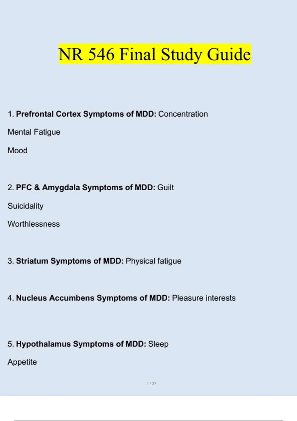 Comprehensive and high-yield study guide for the NR 546 Final Exam, tailored for nurse practitioner students focusing on advanced psychopharmacology. This resource covers key drug classes, mechanisms of action, clinical indications, side effects, black box warnings, and prescribing considerations for psychiatric conditions across the lifespan. Includes evidence-based summaries, diagnostic criteria, treatment algorithms, and case-based insights aligned with Chamberlain University’s curriculum. Perfect for last-minute review, exam prep, or clinical reference. Organized by topic and week, with clear bullet points and mnemonics to enhance retention.