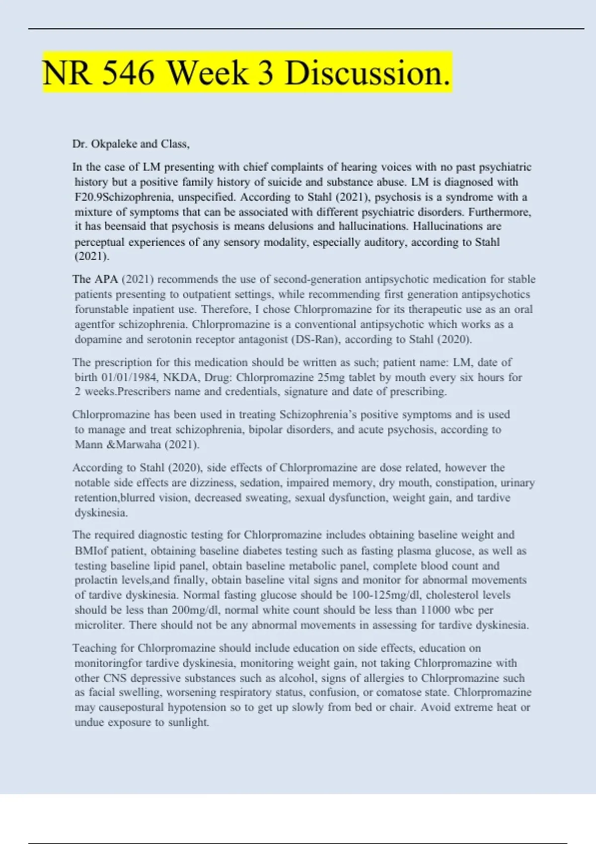 The brequired bdiagnostic btesting bfor bChlorpromazine bincludes bobtaining bbaseline bweight band