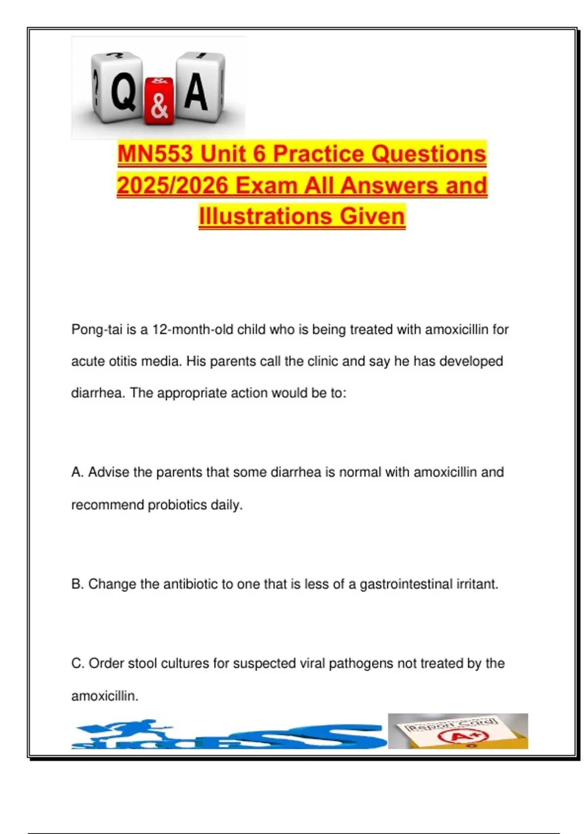 This document presents over 20 expertly crafted multiple-choice questions with verified answers for Unit 6 of MN553: Advanced Pharmacology, following the 2025/2026 curriculum at Purdue University Global. It is a valuable practice resource that targets common clinical scenarios and guideline-based pharmacologic interventions in the treatment of infectious diseases across age groups. The questions cover therapeutic approaches to: Pediatric infections including otitis media, sinusitis, and febrile UTIs Sexually transmitted infections such as gonorrhea, chlamydia, and syphilis, including dual therapy and pregnancy-safe options Tuberculosis (TB) management, first-line regimens, special populations like children and pregnant patients, and drug mechanisms Viral illnesses, such as influenza treatment using neuraminidase inhibitors like oseltamivir Antibiotic stewardship with focus on drug selection, resistance prevention, and appropriate treatment durations The document also integrates case-based learning (e.g., pediatric, adult, and prenatal cases), offering practical preparation for clinical exams, patient management scenarios, and national board certifications. Ideal for students in: NP (Nurse Practitioner) Programs DNP (Doctor of Nursing Practice) MSN (Master of Science in Nursing) PharmD Any healthcare curriculum involving infectious disease pharmacotherapy or primary care Keywords: advanced pharmacology, MN553, antibiotics, otitis media, amoxicillin, TB treatment, rifampin, pyridoxine, urinary tract infection, ciprofloxacin, ceftriaxone, oseltamivir, azithromycin, chlamydia, gonorrhea, syphilis, fluconazole, sinusitis, pediatric infections, antimicrobial therapy, Purdue University Global